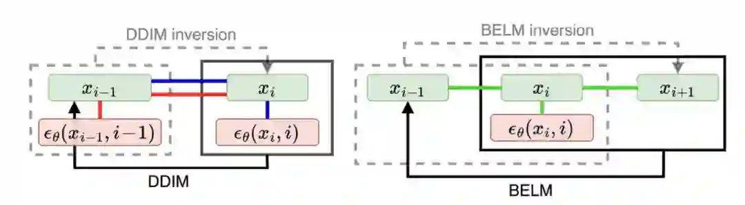**思路起源:DDIM 的正向过程(由蓝线表示)与反演过程(由红线表示)是两种不同的关系,这导致了 DDIM 的反演不准确。如果强制正过程与反过程使用相同关系,又会引入隐式方法,大大增加计算复杂度。如果多引入一个点,不用隐式方法也可逆(由绿线表示)。