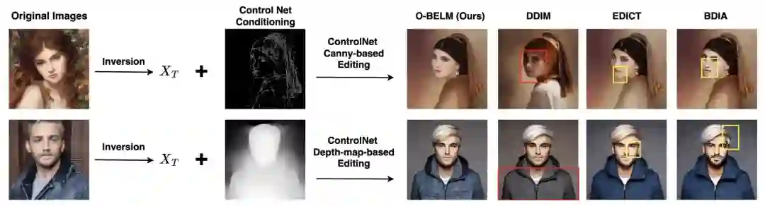由于 O-BELM 是一个采样方法,因此可以无缝地与 controlNet 结合,编辑效果也优于其他方法: **