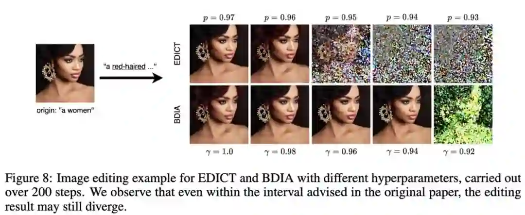 问题:超参数 gamma 不鲁棒,导致采样质量不佳。**EDICT 和 BDIA 参数的不鲁棒:**EDICT 和 BDIA 超参数的意义不明,没有理论指导如何调整,导致不同情形下超参数的选择差别巨大。使用起来极为不便。
