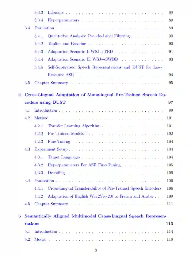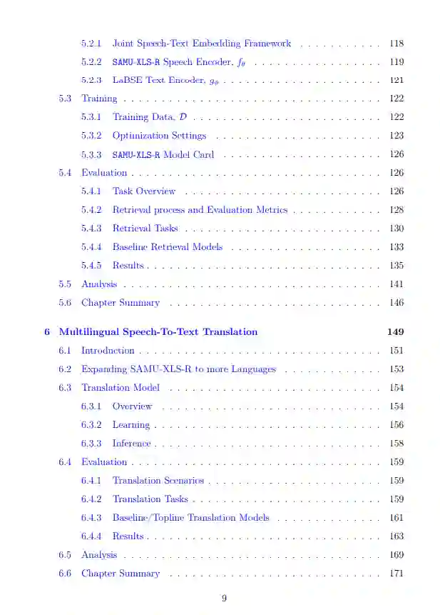 我们的工作的第二部分(第5-6章)关注跨语言迁移学习。第5章提出了一种新的多语言语音编码器,称为语义对齐的多模态跨语言语音表示(SAMU-XLS-R)。与其他多语言语音表示学习框架(Conneau, Baevski等人,2020; Babu等人,2021; Bapna, Cherry等人,2022a)不同,SAMU-XLS-R是一个联合语音-文本嵌入学习框架,它在其学习到的语音表示中编码了语义信息,而其他框架通常编码的是不太可转移的低级语言知识。由于语义知识不受语言限制,因此在学习到的语义表示的基础上构建多语言语音处理模型应该可以提高模型的跨语言可移植性。我们在第6章中展示,使用SAMU-XLS-R语音编码器构建的多语言语音翻译模型,与其他非语义语音编码器相比,能够更好地将任务特定的知识从高资源语言迁移到低资源语言。因此,我们在几个公开的基准测试中显著提高了多语言语音到文本的翻译性能。