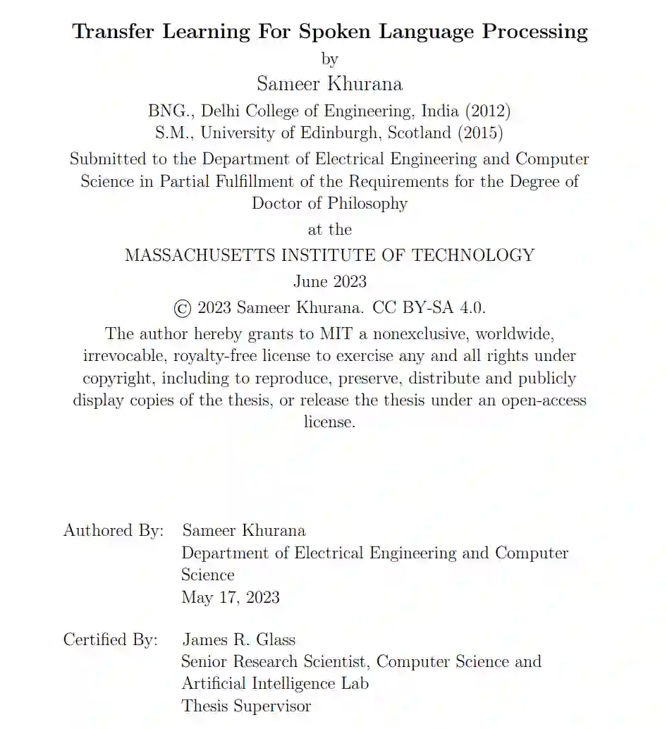 这项工作提出了几种方法来解决语音处理应用中的迁移学习问题。迁移学习是指将从解决源领域中的一个任务中获得的知识转移到一个目标领域中的不同但相关的目标任务的问题。多种学习框架可以被视为迁移学习的一个实例。例如,从大量未标记数据中学习以便用有标记的样本进行少样本学习是顺序迁移学习的一个实例,在这种学习中,我们首先使用自监督学习在未标记的数据上预训练一个模型,然后在少量的手工注释的有标签数据上进行微调。上述顺序迁移学习的著名例子包括自然语言处理中的BERT (Devlin等人, 2019)和语音处理中的Wav2vec2.0 (Baevski等人, 2020)(Zoph等人, 2020)。