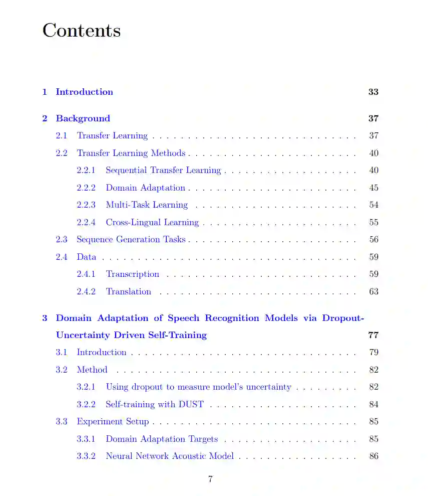 这篇论文开发了用于口语处理应用的迁移学习范式。特别地,我们处理了在自动语音识别(ASR)背景下的领域适应问题,以及在自动语音翻译(AST)中的跨语言学习问题。论文的第一部分开发了一种针对端到端ASR模型的无监督领域适应算法。近年来,由于有了大量的标注语料库和新颖的神经网络架构,ASR的性能得到了显著的提升。但是,当训练数据的分布与模型在部署时遇到的分布(目标领域)不匹配时,ASR的性能会大幅下降。一个简单的解决方法是在目标领域收集标记的数据并重新训练源领域的ASR模型。但是,收集标记的样本往往很昂贵,而未标记的数据则更容易获得。因此,有必要开发无监督领域适应方法。为此,我们开发了一个简单但有效的适应算法,称为Dropout不确定性驱动的自我训练(DUST)。DUST重新利用了经典的自我训练(ST)算法,使其适应领域适应问题。