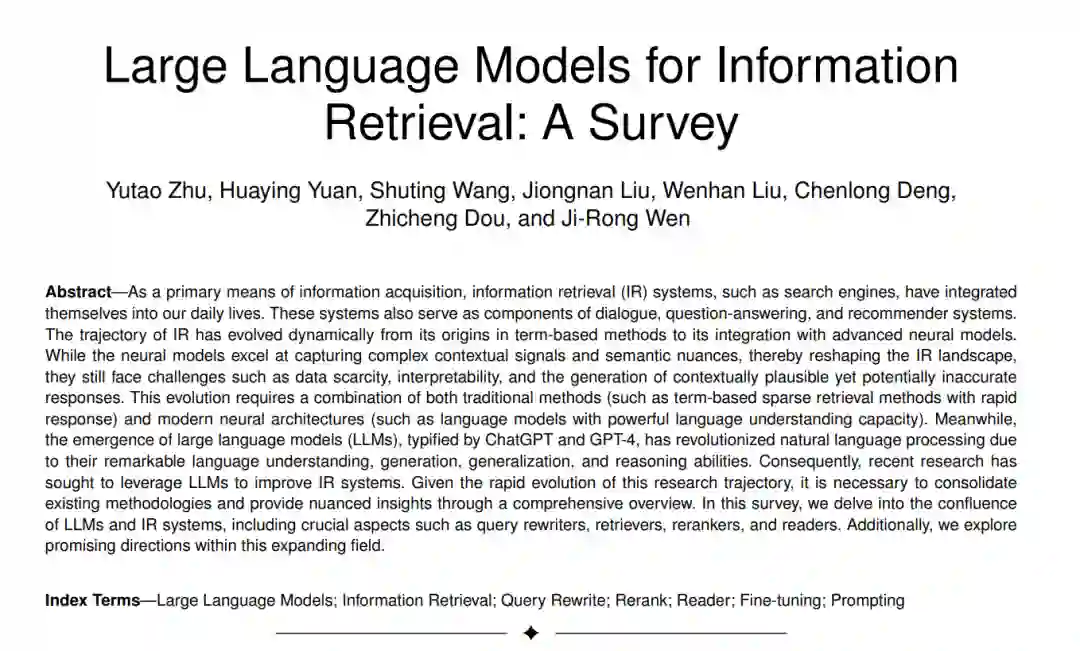在这项综述中,我们深入探讨了LLMs和IR系统的融合,包括查询重写器、检索器、重新排序器和读取器等关键方面。此外,我们还探讨了这个不断扩展领域内的有前景的方向。