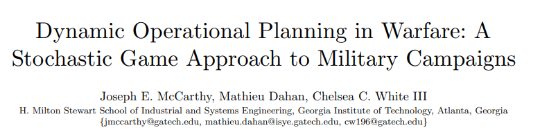本文研究的是军事行动中动态作战规划的双人零和随机博弈模型。在每个阶段,博弈者都要管理多个指挥官,这些指挥官要对具有开放控制线的目标下令采取军事行动。当发生争夺目标控制权的战斗时,其随机结果取决于其他目标控制权所提供的行动和有利支持。每个玩家的目标都是最大限度地增加他们所控制目标的累计数量,并根据其关键性进行加权。为了解决这个大规模随机博弈,我们利用后勤和军事行动指挥与控制结构,推导出其马尔可夫完美均衡的属性。我们证明了最优价值函数相对于部分有序状态空间的等调性,这反过来又导致了状态和行动空间的显著缩小。我们还通过消除受支配的行动和研究每次迭代求解的矩阵博弈的纯均衡来加速沙普利值迭代算法。我们在一个案例研究中展示了均衡结果的计算价值,该案例研究反映了具有地缘政治影响的代表性作战级军事战役。我们的分析揭示了均衡状态下博弈参数和动态之间复杂的相互作用,为战役分析人员提供了新的军事见解。