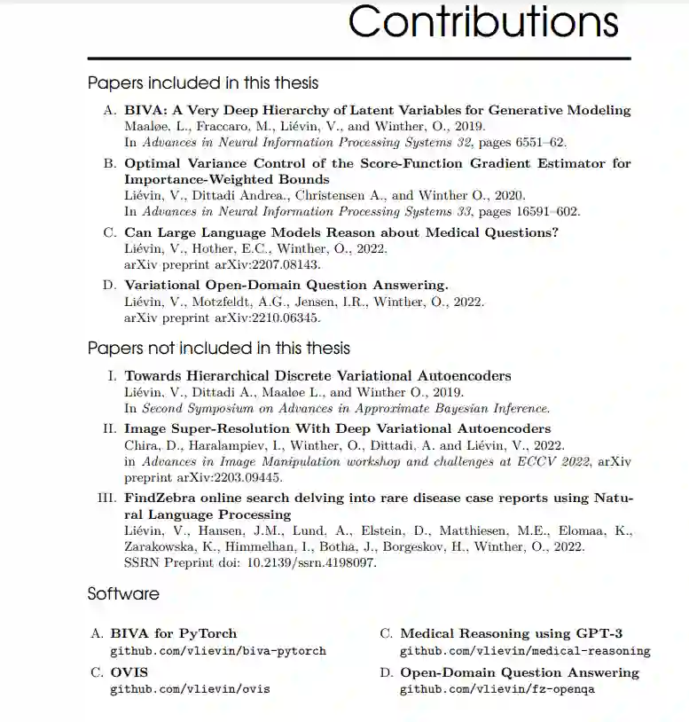 本文探索先进的优化方法和潜变量模型的设计,以完成自然语言处理任务。全文共分为三个部分。在第一部分中,我们提出了隐变量语言模型的三种结构。本文讨论了结构化的潜空间,可以结构化为大型知识库(如维基百科)或以潜文本生成过程为特征。在第二部分中,我们深入研究变分推理和优化的主题。本文提出一种新的离散潜变量梯度估计器OVIS。我们发现,即使使用OVIS,优化深度潜变量模型仍然具有挑战性。本文根据经验数据表明,Rényi散度变分推理可以应用于规避一些学习问题。在第三部分中,我们重点解决医疗问答和信息检索任务。实验提示预训练大型语言模型(GPT-3)生成逐步的问题解决方案。本文报告称,在许多情况下,GPT-3可以推理具有挑战性的医学问题。提出了一个新的框架VOD,用于用变分推理学习检索增强语言模型。本文应用VOD来优化由大量维基百科增强的问答系统,并报告了在医疗问答基准上的最先进性能。最后,将得到的模型应用于罕见病诊断领域的信息检索任务。