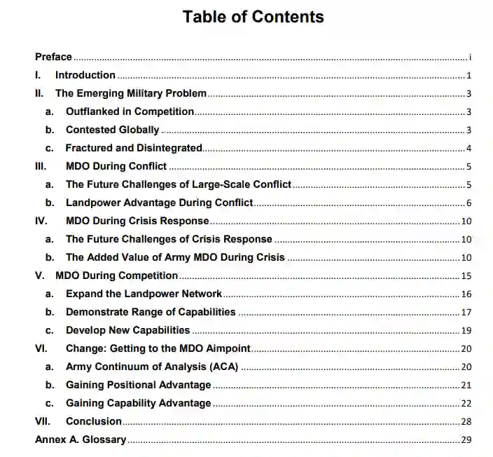《陆军多域转型》描述了美国陆军必须转型以加强其核心能力并成为一支多域部队的原因与方式,在正确的地方拥有正确的能力,以使联合部队从竞争到冲突中获胜。它进一步描述了2018年首次发布的多域作战概念在竞争、危机应对和冲突中的应用,以支持联合全域作战。