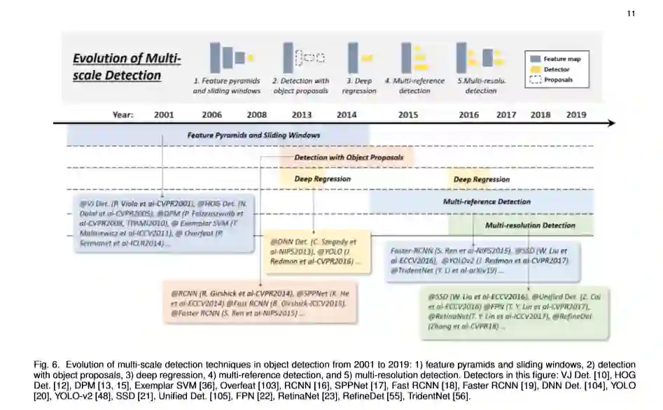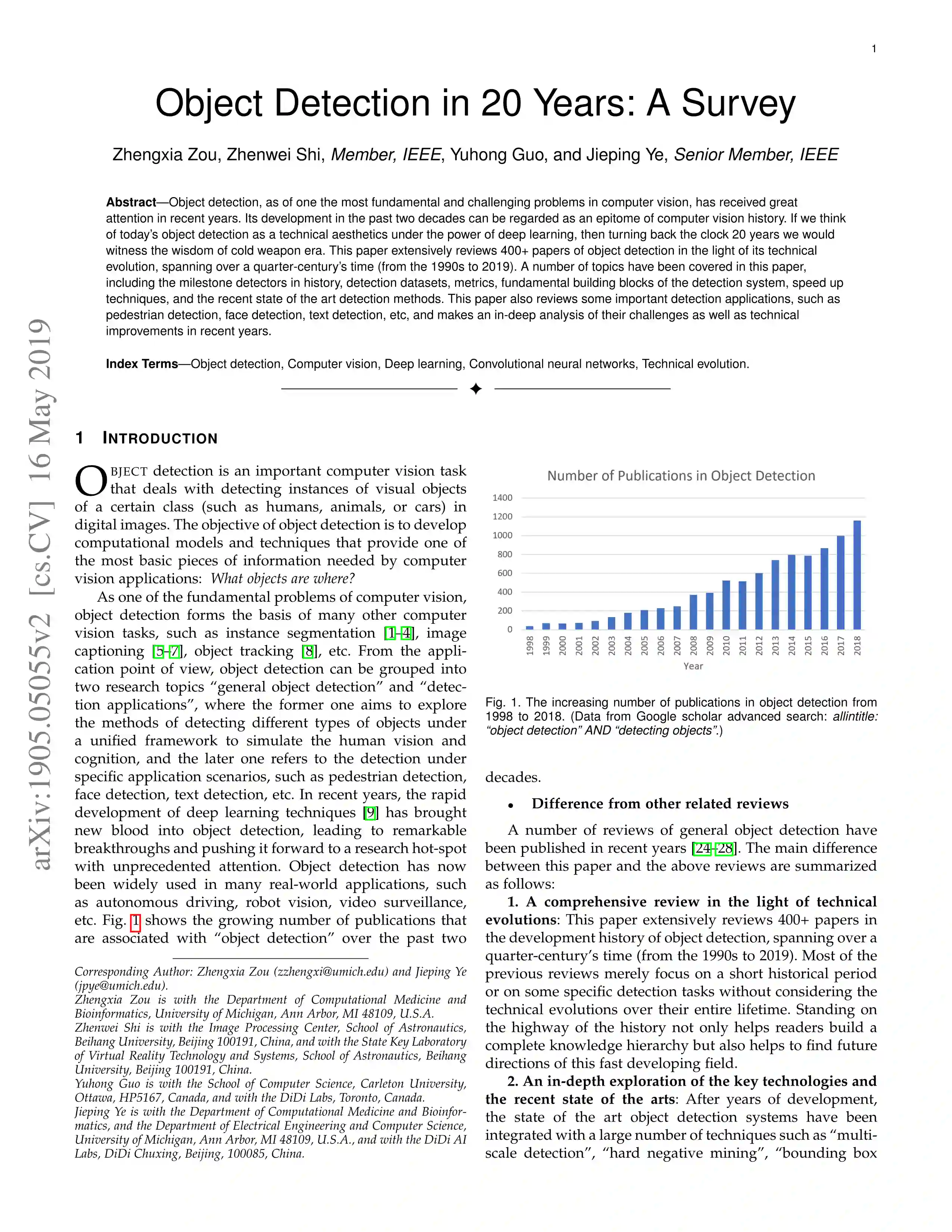 目标检测作为计算机视觉中最基本和最具挑战性的问题之一,近年来受到了极大的关注。它在过去二十年的发展可以看作是计算机视觉历史的缩影。如果我们将当今的物体检测视为在深度学习的力量下的技术美学,那么将时光倒流到20年前,我们将见证冷武器时代的智慧。鉴于目标检测技术的技术发展,本文跨越了四分之一世纪的时间(从1990年代到2019年)广泛地审查了400多篇论文。本文涵盖了许多主题,包括历史上的里程碑检测器,检测数据集,度量,检测系统的基本构建块,加速技术以及最新的检测技术水平。本文还回顾了一些重要的检测应用程序,例如行人检测,面部检测,文本检测等,并对它们的挑战以及近年来的技术改进进行了深入分析。