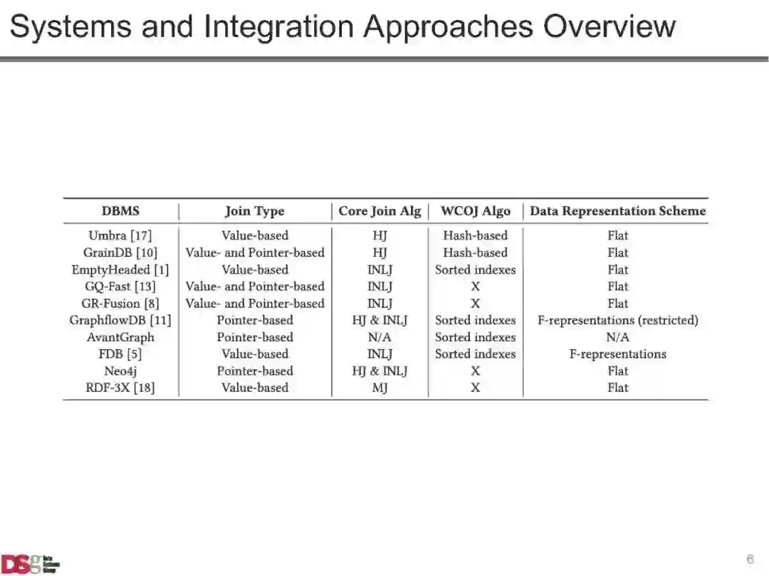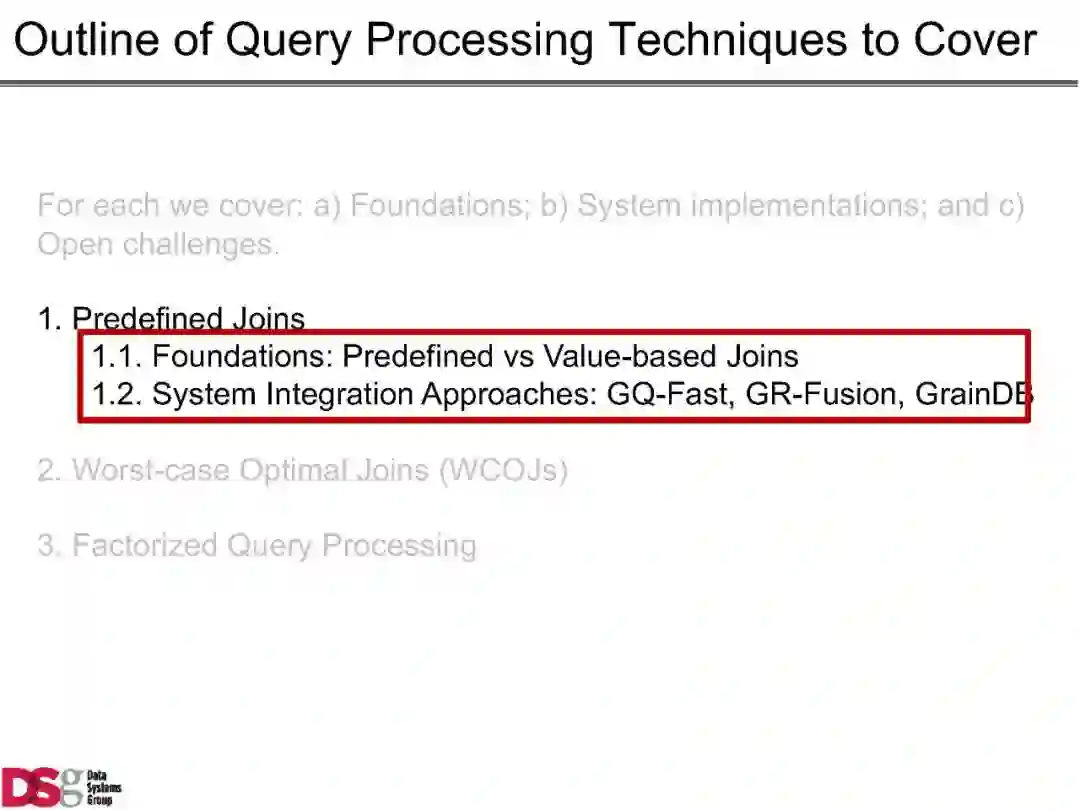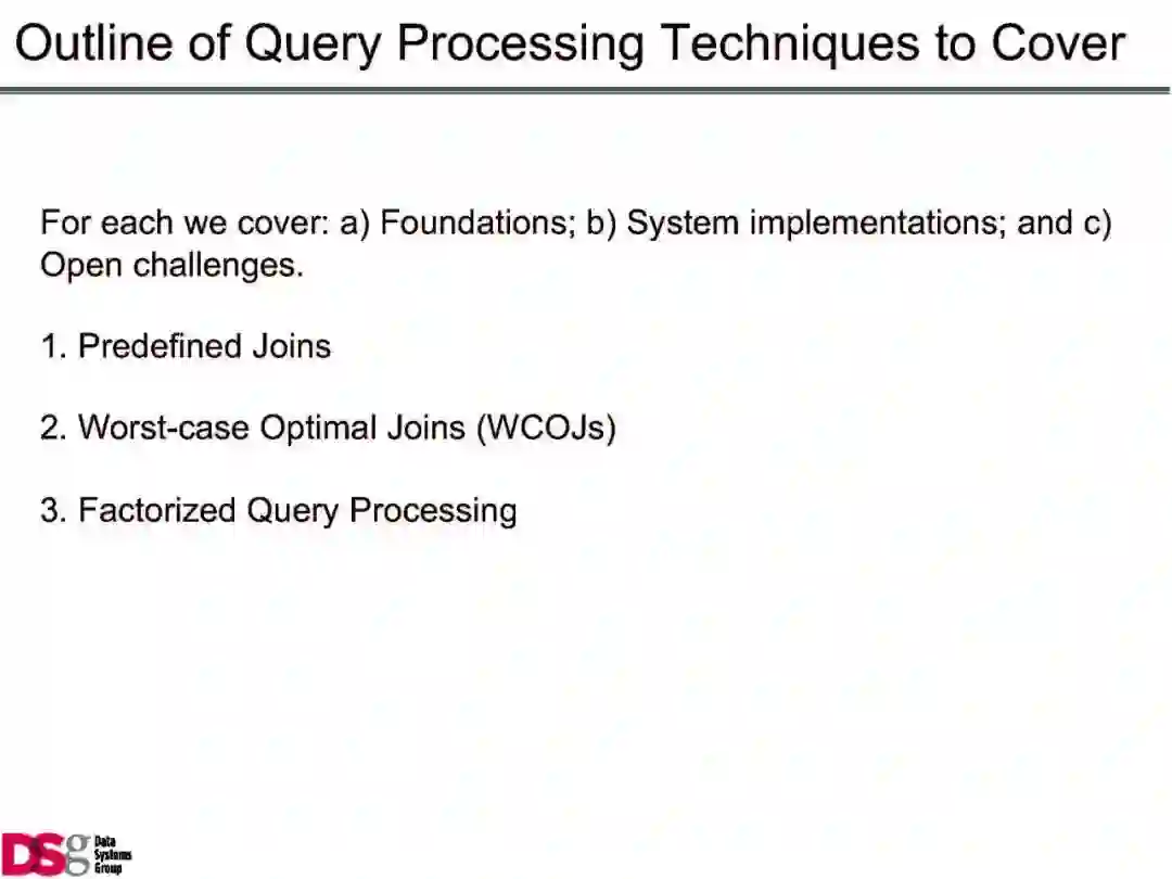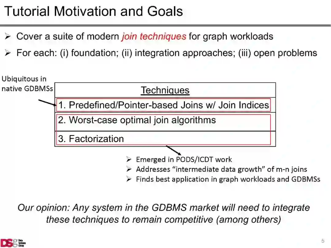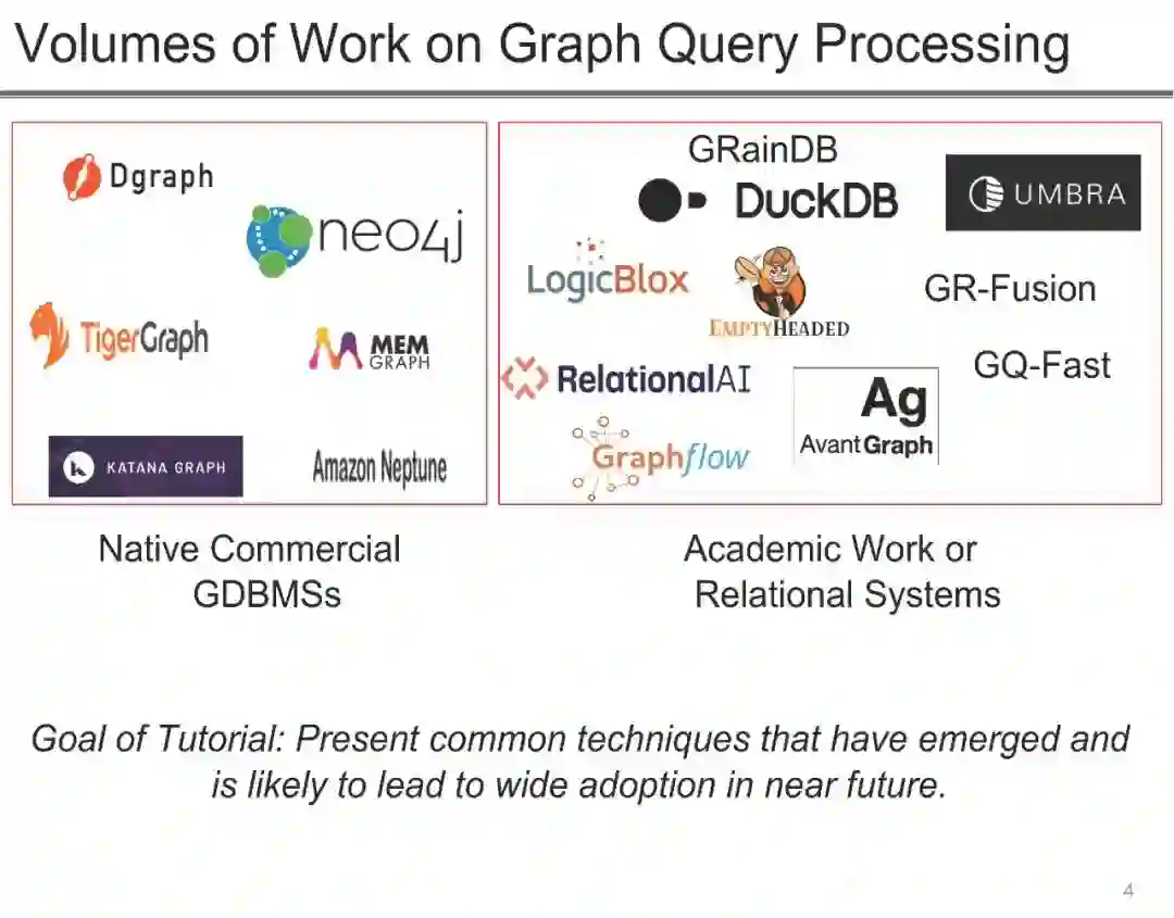 在过去的十年中,出现了许多专门的图数据库系统(RDBMSs)和关系数据库系统的图优化扩展。此外,还在RDBMSs的上下文中引入了几种查询处理技术,例如最坏情况最优连接算法和分解查询处理,它们在图工作负载上得到了最佳应用。在本教程中,我们回顾了针对图工作负载的查询处理技术的最新进展。对于每种技术,我们首先概述其理论基础。然后,我们将概述RDBMSs如何实现这些技术。最后,我们讨论了现有实现方法的开放挑战。