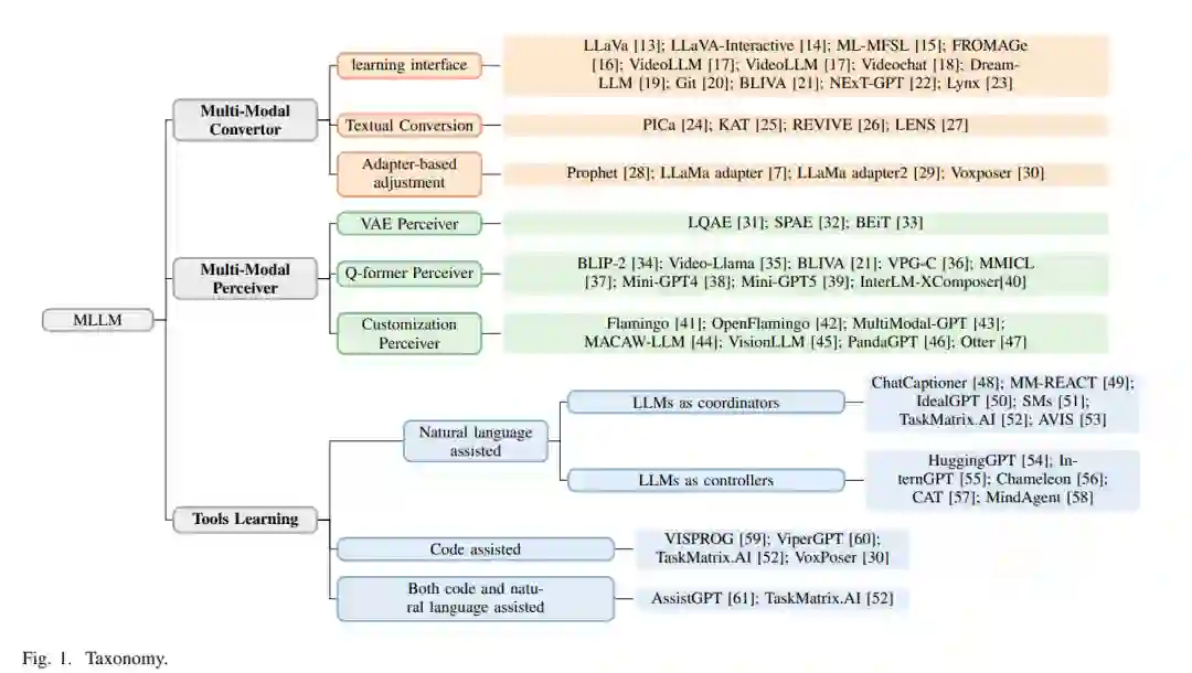• 我们强调了在多模态大型语言模型中弥合模态差距的方法的重要性,并提供了第一个关于多模态信息对齐的综合性综述。 • 我们涵盖了弥合模态差距的四种方法:多模态转换器、多模态感知器、工具辅助和数据驱动方法,并为每种方法提供定义,并追踪它们的发展路径。 • 通过阐明MLLM中多模态信息对齐的不同方法,我们讨论了主要挑战和可能的未来研究方向。