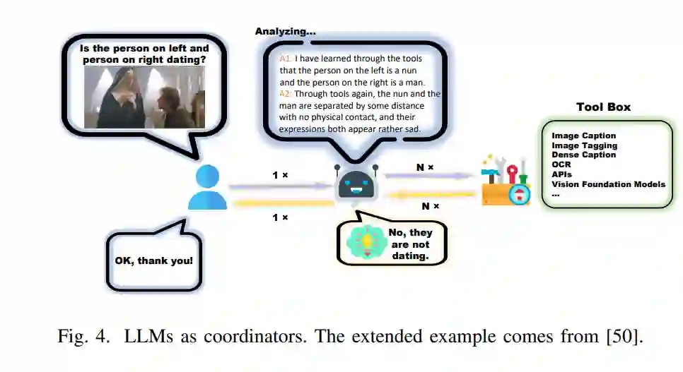 鉴于语言模型(LLM)的显著能力,处理多模态任务最直接的方法是将多模态特征直接输入到LLM中,让它学习和理解这些多模态特征。然而,由于LLM主要在通用文本上进行训练和学习,因此在处理多模态特征时存在不可避免的语义差距。直接注入这些特征可能导致严重的幻觉和偏离事实的答案生成。因此,当代研究人员通常努力将多模态特征,如图像特征,映射到与语言相一致的特征空间中,旨在提高多模态语言模型(MLLM)的性能。 多模态感知器 类似于完全依赖纯文本LLM进行语言理解,利用多模态感知器的LLM旨在通过引入特殊的多模态感知模块来最小化图像和文本之间的语义差距。感知模型是一个多模态感知器,它通过将多模态特征转换为与LLM的嵌入表示空间一致的多模态标记,从而弥合文本模态与其他模态之间的差距。这一过程在图3中进行了抽象表示。也可以考虑更复杂(但成本更高)的方案来连接图像和语言表示,例如Flamingo[41]中的门控交叉注意力和BLIP-2[34]中的Q-former,或者其他提供对象级特征的视觉编码器,如SAM[68]。[13]**工具辅助 **基于人类善于使用工具解决各种问题的深厚能力,许多当代研究努力旨在赋予LLM使用各种工具的能力[49, 50, 52, 54, 55, 61, 80],例如基础模型和API。在MLLM领域中,鼓励LLM利用工具将不同模态转换为统一的模态,主要是文本,以最终完成多模态任务。原生LLM本质上只装备了处理文本输入的能力。因此,研究人员寻求通过构建文本格式(包括自然语言、代码和结构化文本)来指导LLM获得使用工具的技能。这一系列努力可以分为三个主要方法:1) 自然语言辅助;2) 代码辅助;和3) 代码与自然语言同时辅助。这些研究工作通过工具整合扩展了LLM的功能能力,为人工通用智能(AGI)和人工智能代理的未来发展铺平了道路。尽管如此,这些举措取决于LLM的情境学习(ICL)能力,这意味着LLM需要达到一定的模型参数阈值才能有效地获得使用工具的熟练度。
