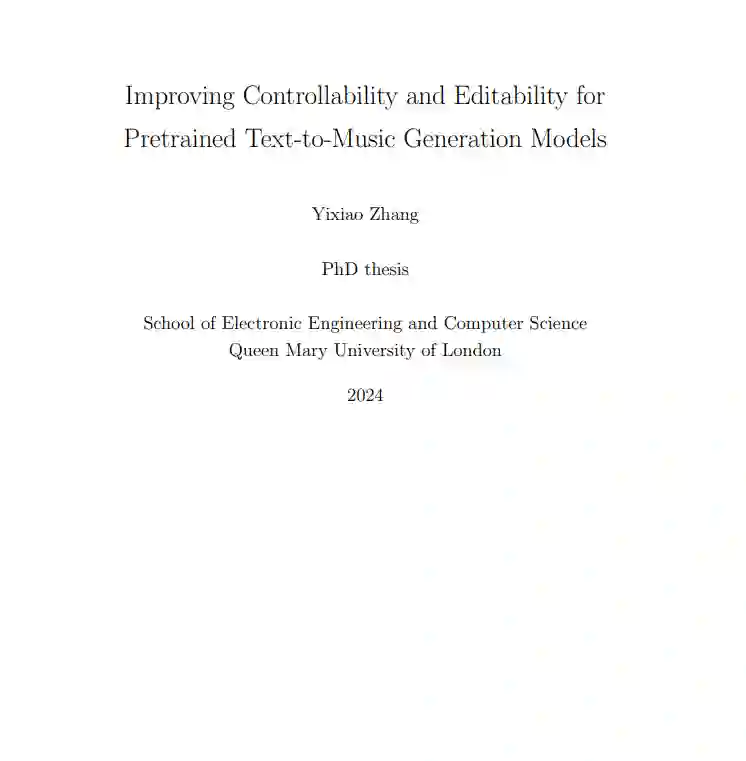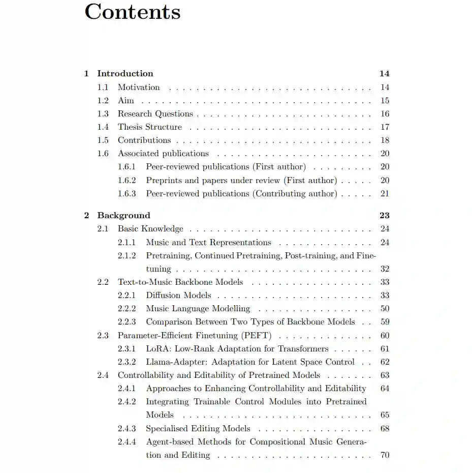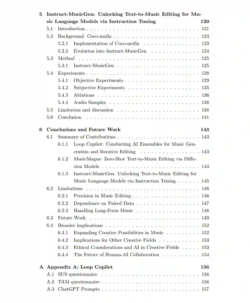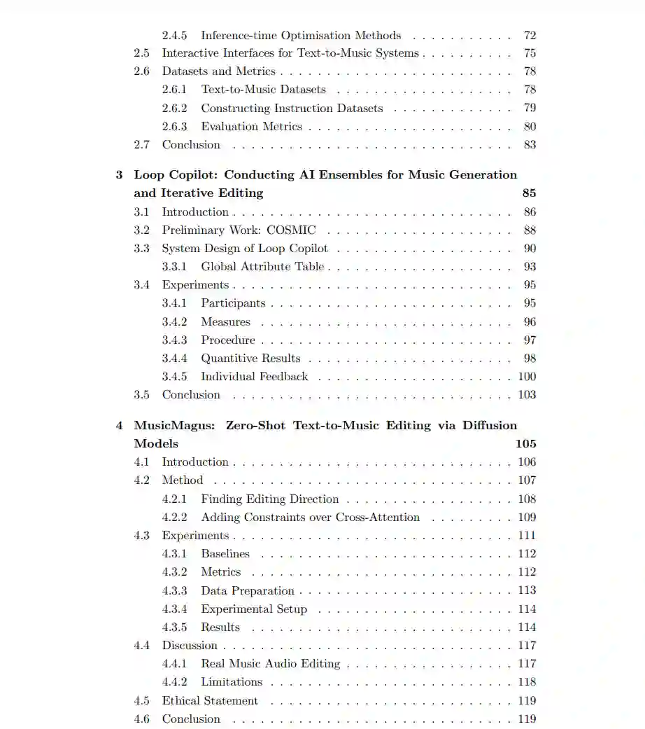 总体而言,这些贡献构成了一个强大的框架,显著提升了人工智能系统在音乐制作中的可控性和可编辑性。通过逐步解决每种方法的局限性,本论文推动了 AI 辅助音乐创作技术的进步,赋能更加灵活、精准和动态的音乐制作流程。