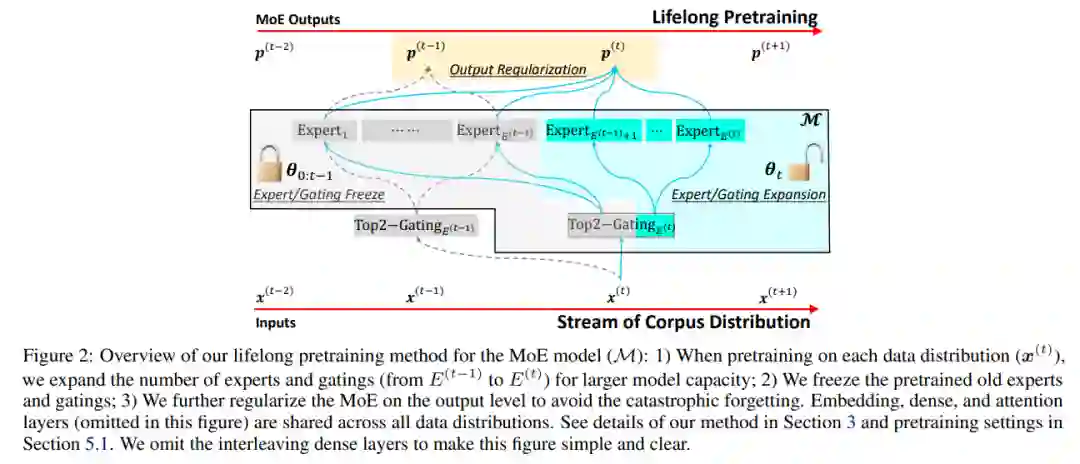 在大规模语料库上进行预训练已经成为构建通用语言模型(LMs)的标准方法。适应新的数据分布以针对不同的下游任务是一项重大挑战。简单的微调可能会导致灾难性的遗忘,当超参数化的LMs过度拟合新数据但无法保留预训练特征时。终身学习(LLL)的目标是使信息系统能够在时间跨度上从连续数据流中学习。然而,大部分先前的工作都是修改训练策略,假定网络架构是静态固定的。我们发现额外的模型容量和适当的正则化是实现强大LLL性能的关键元素。因此,我们提出了Lifelong-MoE,这是一个可扩展的MoE(专家混合)架构,通过添加带有正则化预训练的专家动态增加模型容量。我们的结果表明,只引入有限数量的额外专家同时保持计算成本恒定,我们的模型可以稳定地适应数据分布的变化同时保留先前的知识。与现有的终身学习方法相比,LifelongMoE在19个下游NLP任务上实现了更好的少样本性能。