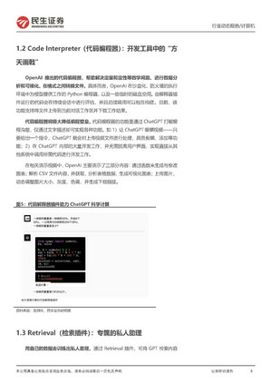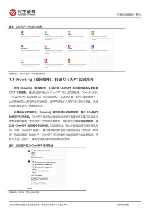 ChatGPT plugin生态伙伴正在愈发繁荣,已知插件的功能包括制定旅游计算、收集财政票据、网上订购、预定餐厅、数学计算等各个方面,包括人们日常应用等各个部分。Plugin已经具备“AI助手”的能力:1、ChatGPT Plugin可以及时更新实时信息;2、ChatGPT Plugin更具有服务化的意识;3、办公领域中,扮演更加类似“助手”的作用,此外Plugin调用极其便捷,我们认为功能类似微信的“小程序”;此外,Plugin创建第三方插件同样方便快速。 我们认为Plugin意义非凡,打开海量应用空间。Plguin的出现正式成为引爆“AI+”的关键导火索,各类应用有望快速接入“大模型”,从而使“AI+”赋能千行百业,使用者可以通过插件的方式让客户通过简单自然语言的对话,就可以完成复杂的任务,比如文档操作、编程、预定参订、食材等操作;此外,我们认为Plugin的商业模式与苹果APPStore有异曲同工之妙,Plugin的出现即为AI时代的流量和客户的入口。我们认为AI加速赋能应用的时代已经到来,目前来看,大模型的赋能应用的场景只限于自然语言处理,我们认为未来计算机视觉、多模态、生物计算同样有望引爆应用市场,同时,我们认为未来5-10年内,所有的科技应用有望在大模型的加持下大放异彩,包括医疗、教育、办公、工业等多方面。 高于操作系统战略的地位 Plugin。 通过多插件的相互协同构建私人定制的 人工智能管家将是 OpenAI 的未来形态。通过 ChatGPT 释放出的第一批第三方插件中,基本全方位覆盖衣食住行、情感交互、工作以及学习等日常所需。而相关插件的能力将通过 ChatGPT Plugins 的三大基础套件: Browsing(联网插件)、Code Interpreter(代码编程器)以及 Retrieval(知识检索插件) 目前通过多类插件的协作,可以实现多应用的协同,其本质上类似于 24x7 的私人助理。 不可忽视的战略意义:复制苹果生态的伟大历程。 OpenAI 正沿着类苹果模式的“终端+平台+生态”,迈向高于操作系统的战略地位。引入插件 Plugin 标志 ChatGPT 走在创建生态系统的伟大道路上,统一平台+插件的模式有望构建与苹果+App Store 相似的繁荣生态。复盘苹果生态模式发展进程,我们发现ChatGPT 已经具备全部的先决条件: 通过 ChatGPT 划时代的交互方式抢占终端的制高点,对标 iPhone 4 发布;发布 Plugin 并推出“交互+编程+个人助手”三大套件,对标 APP Store 模式,打造苹果式的手机体验; 宣布接入海量应用插件,在统一平台上形成功能相互协同=App Store 通过排行榜、搜索等方式帮助 iPhone 用户快速找到想要的应用程序的 “苹果平台”商业模式。 ChatGPT 自身的三大套件是构建海量插件相互协同的核心抓手,其目的是通过将多插件形成对用户的全方位覆盖,最终形成专属个人的 AI 管家。 从ChatGPT 的首批接入的插件厂商即可看出 OpenAI 的目标是覆盖人类生活的全维度。通过调节和协作相关插件, ChatGPT 从本质上转变为每个人的私人助理。当个人可以通过同一平台同时安排衣食住行、工作、娱乐乃至教育的任务部署,将构建不可打破的高粘性,并反哺于 GPT 模型的优化,最终进一步扩展ChatGPT-PlugIn 的战略宏图。