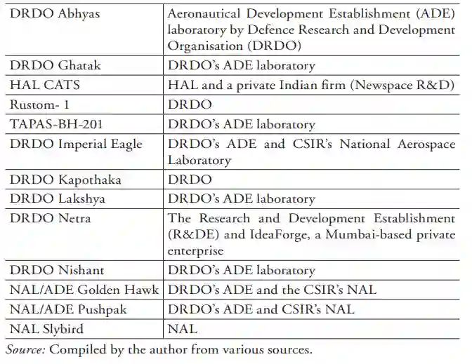 由于无人机零部件成本的下降和政府支持本土制造的举措,一些国家现在有机会独立于全球供应商购买无人机。印度正在加入无人机本土化的竞争,这在这个技术驱动的世界中正迅速成为一个优先事项。印度还在开展多个无人机项目,详见表 2。其中一些是原型机,如 DRDO "帝国之鹰"、航空发展机构实验室(ADE)和 CSIR 国家航空航天实验室(ADE/NAL)"金鹰"、国家航空航天实验室(NAL)"狡鸟 "和国家航空航天实验室/ADE "普什帕克 "等,还有一些处于开发阶段,如 HAL CATS。值得注意的是,有些无人机属于 "目标无人机 "类别,如 DRDO Abhyas 和 DRDO Lakshya。