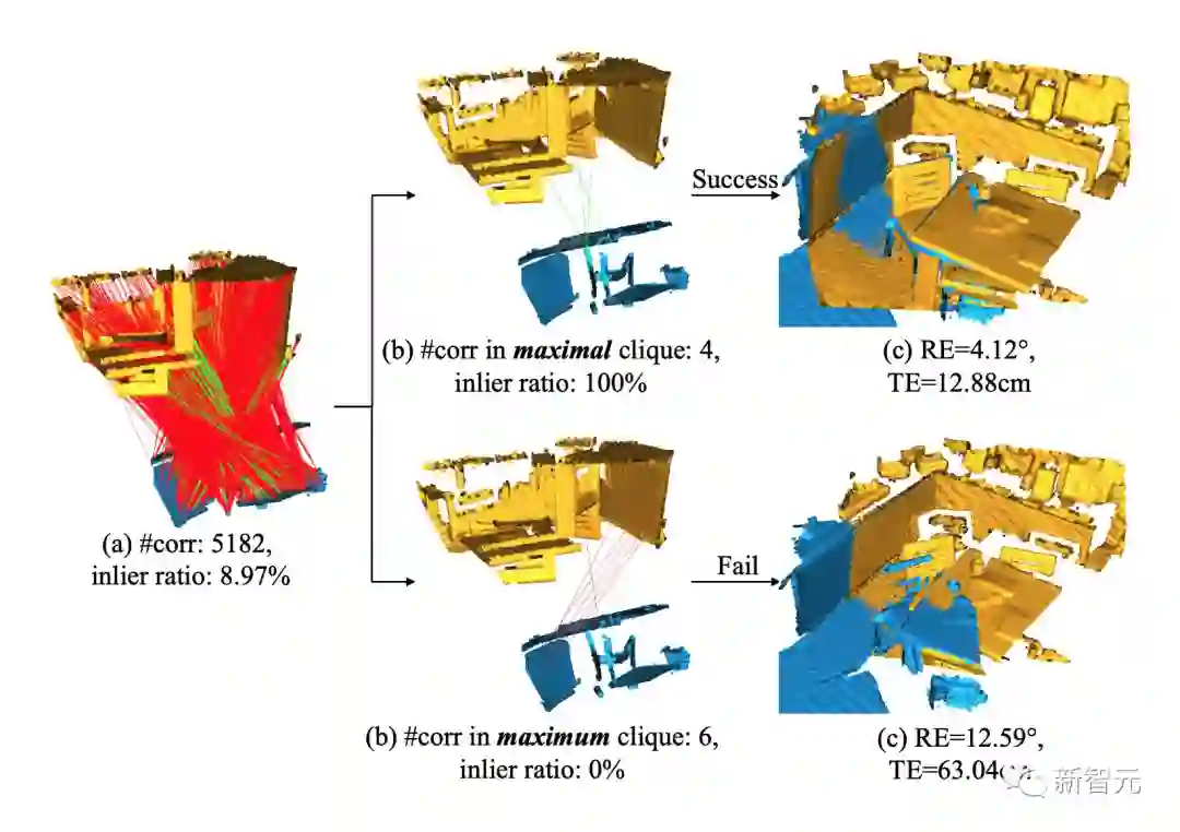 1)构建相容图来呈现初始对应关系之间的亲和关系; 2)在图中搜索最大团,每个团代表一个一致性集合。然后执行节点引导的团选择,其中每个节点对应于具有最大图权重的最大团。 3)通过奇异值分解算法计算所选团的变换假设,并选择最佳假设进行配准。