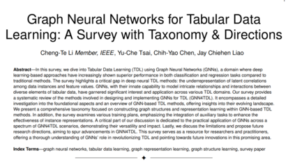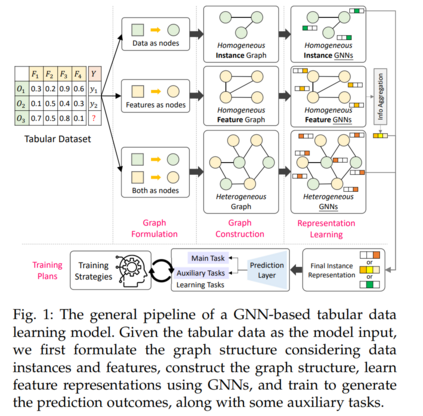近年来,基于深度学习的表格数据学习(TDL)方法,例如分类和回归,表现出了令人充满希望的性能。然而,尽管在从原始表格记录中学习有效特征表示方面有很大能力,深度神经TDL在数据实例和特征值之间的潜在相关性建模上表现薄弱。通过建模高阶实例-特征关系、高阶特征交互和数据实例之间的多关系相关性,已显示可以改进TDL的预测性能。作为自然地建模不同数据实体之间的关系和交互的对策,图神经网络(GNNs)近来已经受到极大关注。通过适当地从输入表格数据构建图结构,GNNs可以学习数据元素之间的潜在相关性,并为预测任务生成有效的特征表示。受到GNNs在自然语言处理和推荐系统上的成功启发,开发用于表格数据学习的图神经网络(GNN4TDL)的趋势也在增加。目前,已有一些早期研究努力尝试将现有的GNN方法应用于表格数据学习。一些非常近期的研究也开始探索特定于TDL的GNNs。这些研究几乎涵盖了所有TDL主题和应用,掀起了该领域的一波研究热情。随着这些研究进展,也产生了一些基本问题:(a) 基于GNN的TDL与传统TDL之间有何区别?(b) 在不同TDL场景和任务下构建图结构的正确方式是什么?(c) 基于GNN的表格数据表示学习背后的原理是什么?(d) 哪些TDL任务和应用领域可以从GNNs中受益?(e) 当前研究的局限性和未来研究的潜在机会是什么?尽管最近的GNN4TDL研究报告了令人鼓舞的结果,但这些问题尚未系统地调查,甚至被忽视了。迫切需要进行这项GNN4TDL综述,以揭示这些问题的答案,以进一步促进这一研究方向。我们相信,由于该主题的高需求和低支持,这项GNN4TDL综述将具有很高的价值。(a) 高需求:由于表格数据在许多领域和应用中无处不在,人们逐渐将重点转移到模型数据实例之间的关系及其与特征值的相关性上,我们相信,用于表格数据学习的图神经网络不仅将具有很高的研究影响,而且还将具有实际价值。它应该能够获得学术界和工业界的关注。(b) 低支持:我们的GNN4TDL处于一个小众但至关重要的领域,根据表1中的比较总结,在以前的综述中大多被忽视。与其他集中在跨各种领域和数据类型的广泛GNN应用的工作不同,这篇综述不仅强调了GNN在表格数据预测、表示学习和图结构学习中的潜力,而且还是首次讨论自监着学习、各种训练策略和GNN4TDL中特定的辅助任务。这篇综述论文对应用GNNs进行表格数据学习进行了深入探索。它首先建立了基本的问题陈述,并介绍了用于表示表格数据的各种图类型。综述围绕详细的基于GNN的学习流程进行构建,包括图形化阶段,将表格元素转换为图节点;图构建,专注于建立这些元素之间的连接;表示学习,强调GNNs如何处理这些结构以学习数据实例特征;以及训练计划,讨论辅助任务和训练策略的整合,以提高预测结果。除了回顾GNN4TDL技术之外,综述还进一步阐述了GNN在多个领域的应用,如欺诈检测和精准医疗,以及对当前研究局限性和GNN4TDL领域未来方向的批判性讨论。