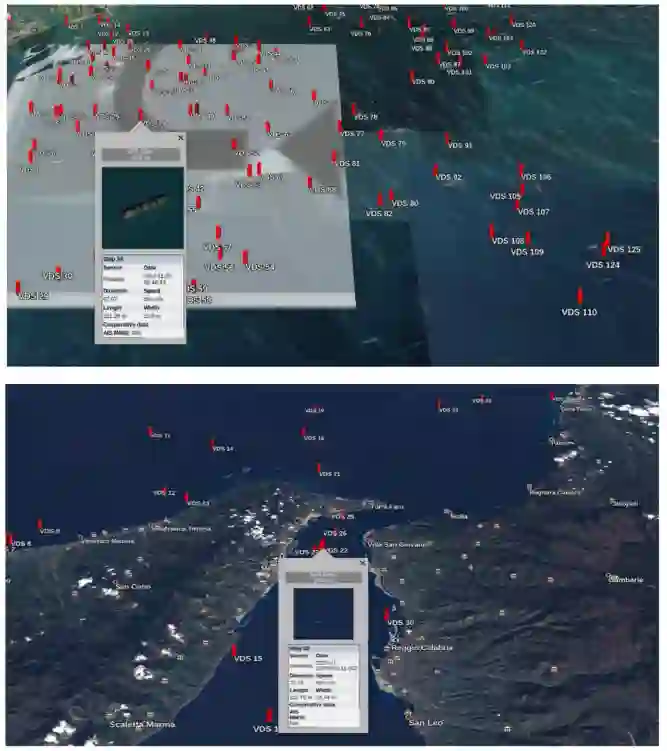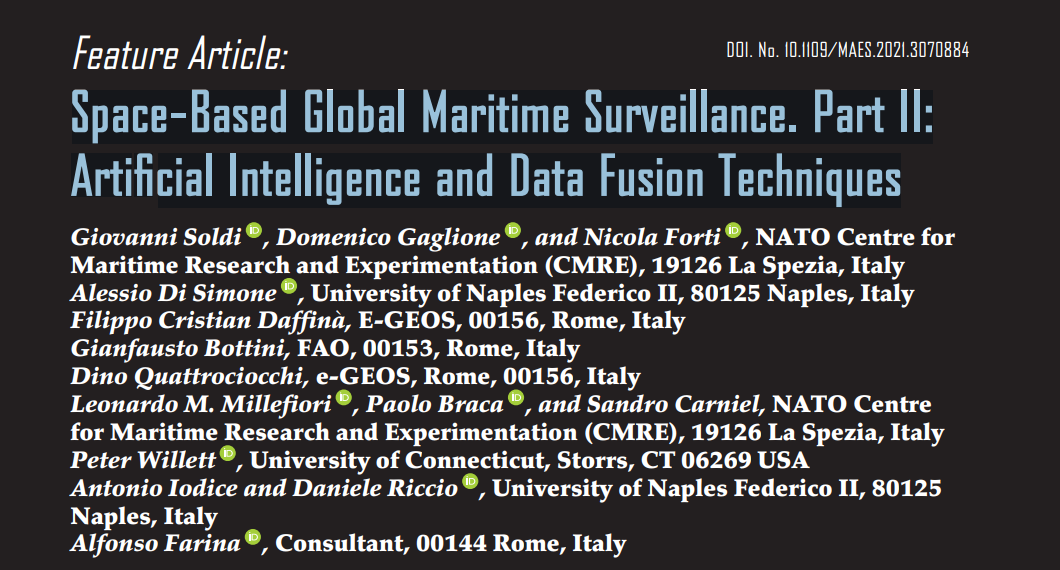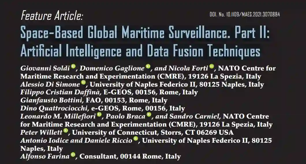 由于天基传感器技术的部署和普及,现在亟需先进的数据处理范式,如大数据分析、机器学习、人工智能(AI)和数据融合,以充分利用大量卫星图像数据集。特别是,开发结合多种传感器的 MS 系统需要专门的算法来处理原始卫星图像、检测和分类船只,以及融合来自异构传感器的信息。这些算法通过处理和组织日益增多的异构信息为 MS 提供支持。从中提取的数据和易于理解的信息将帮助政府和军事当局、海岸警卫队和警察等最终用户发现异常情况,以及石油泄漏、海盗和人口贩运等威胁,并及时采取行动,防止事故和不法行为的发生。在工作的第二部分,我们将介绍一些最新的人工智能和图像处理技术,用于图像分割、目标检测和分类,并提供卫星传感器获取的真实图像的可能用例。然后,我们将介绍最新的贝叶斯和统计融合技术,以便从卫星-AIS 历史数据库中提取知识(如最常见的海上航线),并通过融合多个异构传感器收集的信息来跟踪多个目标。其中,基于和积算法(SPA)的多目标跟踪(MTT)算法越来越受欢迎,这得益于其融合异构来源信息的能力、可扩展性(即在信息源、目标和测量值数量方面计算复杂度较低)以及包含上下文信息(如从卫星图像中提取的海上航线和船舶等级信息)的能力。此外,还提供了一个使用案例,证实了基于 SPA 的 MTT 算法在与卫星传感器获取的信息相结合时的优势。