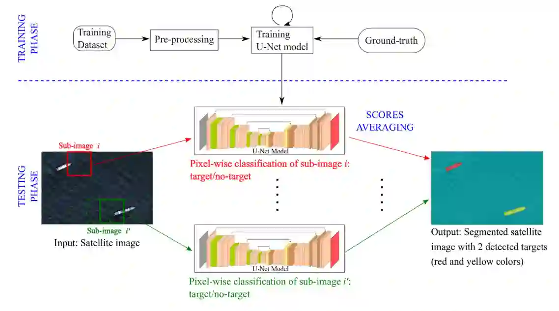图 2. 基于 U-Net 架构的卫星图像分割任务的一般工作流程示例,其中池化操作被上采样操作所取代。所选 DNN 架构经过训练,可使用预处理卫星图像的训练数据集执行像素分类(目标/非目标),这些图像已根据地面实况进行了人工分割(训练阶段)。在这一阶段,通过最小化适当的成本函数来优化 U-Net 模型参数。然后使用训练好的 U-Net 模型对测试卫星图像进行像素分类(测试阶段)。具体来说,测试卫星图像被分为 N 个子图像;对于每个子图像 i,U-Net 模型中的最终 Softmax 层会为每个像素分配一个分类分数。通过对重叠子图像中每个像素的得分进行平均,最终得到分割后的卫星图像。