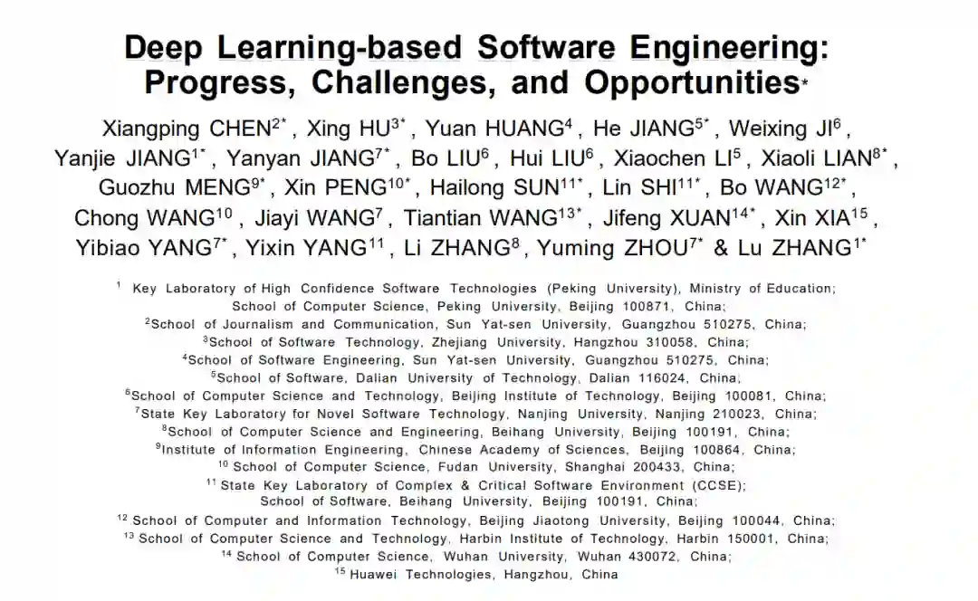 近年来,深度学习取得了令人瞩目的进展,最早由Hinton等人在2006年提出[1]。由于Hinton等人[3]提出的无监督逐层训练,深度神经网络的训练主要障碍被克服。从那时起,大多数人工智能(AI)研究人员转向深度学习,构建包含数十、数千甚至数百万层的深度神经网络[4]。他们还提出了各种新颖的深度神经网络结构,如卷积神经网络(CNN)[5]、循环神经网络(RNN)[6]、长短期记忆网络(LSTM)[7]、双向LSTM[8]以及Transformer[9]。随着深度学习的进步和普及,硬件厂商如NVIDIA推出了专门为深度学习设计的更强大的计算设备。这一切共同推动了机器学习技术的发展,并使基于深度学习的人工智能成为21世纪最有前景的技术之一。 鉴于深度学习的显著进展,各种深度学习技术已被用于完成软件工程任务[10]。尽管自然语言处理(NLP)、图像和视频处理以及语音处理是当前深度学习技术的主要目标,深度学习也已成功应用于众多领域,包括数据挖掘[11]、机械制造[12]、生物医学工程[13]和信息安全[14]。在软件工程领域,研究人员成功利用各种深度学习技术完成了诸多重要任务,如代码生成[15]、代码补全[16]、代码摘要[17]、软件重构[18]、代码搜索[19]、故障定位[20]、自动化程序修复[21]、漏洞检测[22]和软件测试[23]。在所有这些任务中,深度学习技术已被证明是有用的,显著提升了现有技术水平。深度学习驱动的软件工程成功的一个可能原因是深度学习技术的显著进展,另一个可能原因是大量的软件工程数据公开可用于训练先进的神经模型。随着开源软件应用的普及,开发人员分享了大量的软件需求、源代码、文档、缺陷报告、补丁、测试用例、在线讨论以及不同工件之间的日志和追踪关系。这些数据为软件工程任务训练专门的深度神经模型提供了可行性。 据我们所知,已有几篇关于深度学习在软件工程中应用的综述(例如,Yang等人[10],Watson等人[24],以及Niu等人[25])。虽然这些综述提供了深度学习在软件工程中应用的整体图景,但仍缺乏对深度学习技术在软件工程各子领域进展、挑战和机遇的详细分析。