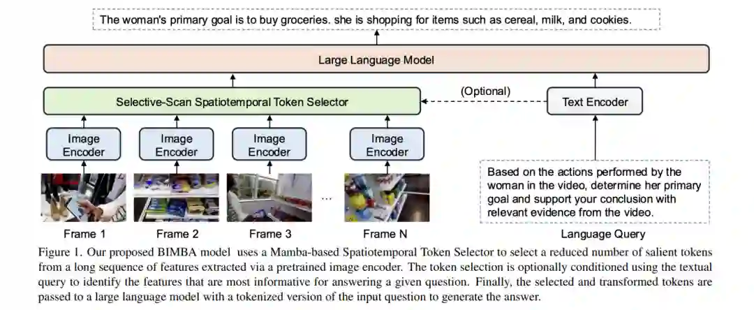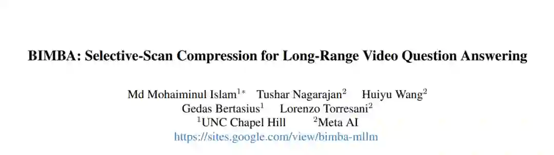 在长视频中进行视频问答(VQA)面临的关键挑战是从大量冗余帧中提取相关信息并建模长范围依赖关系。自注意力机制为序列建模提供了一种通用解决方案,但当应用于长视频中的大量时空标记时,其计算成本极高。大多数现有方法依赖于压缩策略来降低计算成本,例如通过稀疏帧采样减少输入长度,或通过时空池化压缩传递给大型语言模型(LLM)的输出序列。然而,这些简单方法过度表示冗余信息,常常遗漏显著事件或快速发生的时空模式。在本研究中,我们提出了BIMBA,一种高效的状态空间模型,用于处理长视频。我们的模型利用选择性扫描算法,学习从高维视频中有效选择关键信息,并将其转换为简化的标记序列,以实现高效的LLM处理。大量实验表明,BIMBA在多个长视频VQA基准测试中达到了最先进的准确性,包括PerceptionTest、NExTQA、EgoSchema、VNBench、LongVideoBench和VideoMME。代码和模型已公开,访问地址为:https://sites.google.com/view/bimba-mllm。