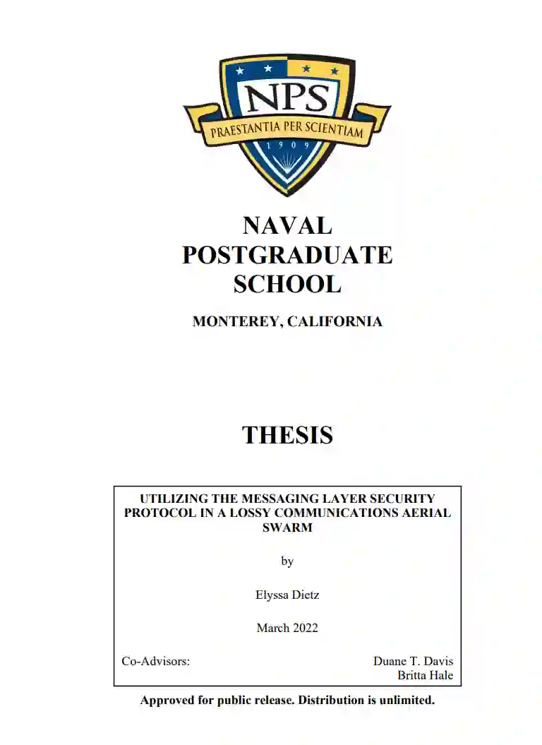 最近无人驾驶飞行器(UAV)能力的进步导致对蜂群系统的研究越来越多。然而,无人机群的战术应用将需要安全通信。不幸的是,到目前为止的努力还没有产生可行的安全通信框架。此外,这些系统的特点是有限的处理能力和受限的网络环境,这使得许多现有的安全群体通信协议无法使用。最近在安全群组通信方面的研究表明,消息层安全(MLS)协议可能为这些类型的系统提供一个有吸引力的选择。这篇论文记录了MLS与先进机器人系统工程实验室(ARSENL)无人机群系统的整合情况。ARSENL的实施是为了证明MLS在安全蜂群通信中的功效,是一个概念验证。实施的测试结果是在模拟环境中进行的实验和用物理无人机进行的实验。这些结果表明,MLS适用于蜂群,但需要注意的是,测试中没有实施交付机制以确保数据包的可靠交付。对于未来的工作,如果要维持一个可靠的MLS系统,需要缓解不可靠的通信路径。