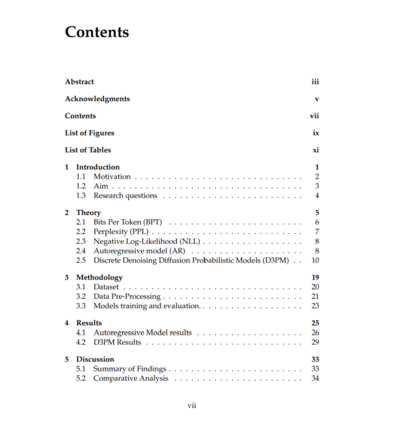 扩散模型作为一类强大的生成模型,在图像合成、视频生成等连续数据领域取得了最先进的性能。其核心机制包括一个正向扩散过程——逐步将结构化数据转化为类高斯分布——以及一个学习得到的反向扩散过程,用于重建原始数据。尽管该框架在连续模态上已被证明是有效的,但将其应用于离散数据,尤其是自然语言,仍是一个具有挑战性且研究活跃的课题【1】。主要难点包括建模离散标记之间的依赖关系的复杂性,以及缺乏自然定义的生成顺序。 本论文研究了离散扩散模型在自然语言生成中的可行性与性能表现。具体而言,我们考察了**离散去噪扩散概率模型(Discrete Denoising Diffusion Probabilistic Model,D3PM)2.5,并将其性能与传统的自回归(Autoregressive,AR)2.4语言模型进行了对比。为评估和比较两种模型的生成能力,我们使用了诸如每个标记的比特数(Bits Per Token, BPT)**2.1、**负对数似然(Negative Log-Likelihood, NLL)**2.3、**困惑度(Perplexity, PPL)2.2以及批处理速度(Batch Processing Speed)**等常见指标。 实验结果【4】表明,表现最好的 D3PM 模型在 BPT 上达到了 5.72,平均值为 8.05。相比之下,AR 模型的平均 BPT 为 4.59,表明其在压缩效率和生成效率方面更具优势。然而,D3PM 模型在批处理速度方面表现更优,最高可达每秒 3.97 个批次,显示出其在并行生成方面的潜力。 所有评估均在统一条件下进行——每个模型生成 100,000 个标记,批次大小固定为 4——以确保公平和可比性。本研究提供了扩散模型与自回归模型的详细对比分析,揭示了它们各自的权衡与差异。最终,研究结果既突显了扩散模型在离散序列建模方面的潜力,也指出了其当前的局限性,为未来在非自回归语言生成框架中的探索奠定了基础。本研究所使用的源码已开源,仓库地址为: https://github.com/AshenWELI/Discrete-Diffusion-Models-for-Language-Genaration。