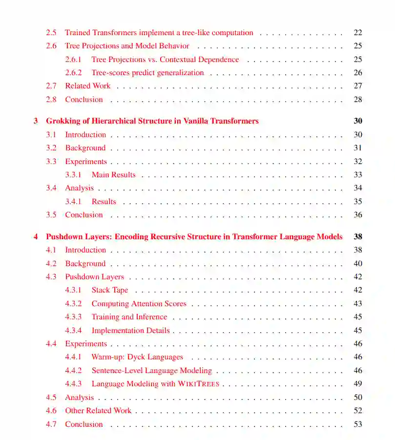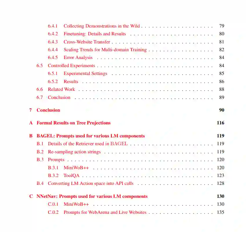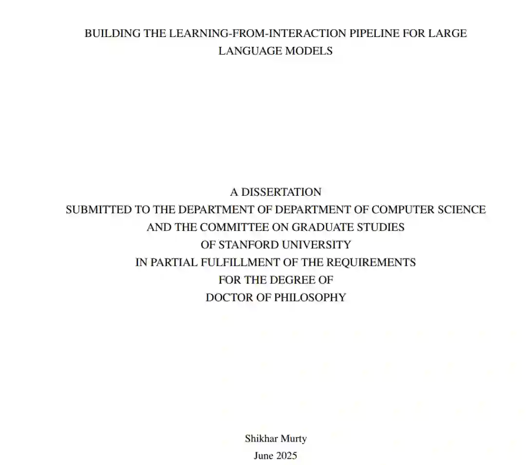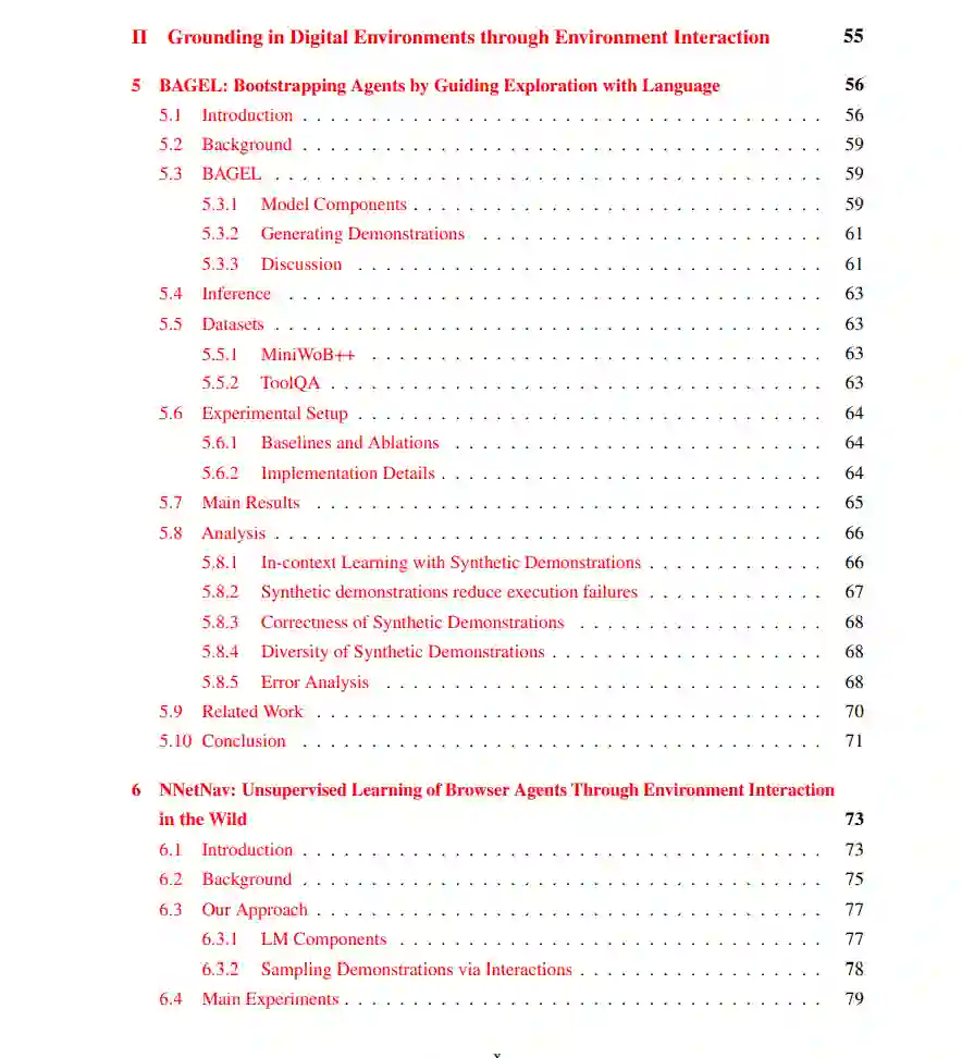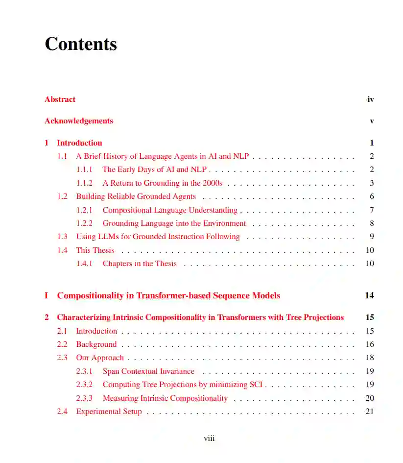 大语言模型(LLMs)已展现出卓越的能力,越来越多的研究致力于将其作为智能体(agents)使用——即能够将自然语言表达的复杂人类目标转化为在数字环境(如网页浏览器)中的一系列操作行为。要实现这一目标,需具备两个核心能力:第一,理解任意组合性的语言输入;第二,在陌生环境中自主学习,以便将语言目标有效地落实为多步决策行为。本论文正是围绕这两个挑战展开研究。 在第一部分中,我提出了 Tree Projections 框架,用于理解 Transformer 如何构建组合性结构。随后,我基于 Tree Projections 提出一系列研究成果,揭示了 Transformer 中组合泛化(compositional generalization)、“顿悟”现象(grokking)以及样本高效学习的机制。尽管 Tree Projections 有助于解释模型的泛化能力,已有研究表明标准 Transformer 在处理深层递归时表现不佳,其根本原因是缺乏支持无限层级结构的机制。为此,我提出了 Pushdown Layers,一种引入基于栈的记忆机制的结构增强方法。Pushdown Layers 能够提升模型在嵌套或递归推理任务中的样本效率与泛化能力。 在第二部分中,我介绍了 NNetNav 与 BAGEL,两种用于网页环境中无监督、开放式探索的方法,使得模型能够在无需人工监督的情况下,自动为新网页采集训练数据。最佳效果来自于结合 NNetNav 所采集的示范数据对 LLM 进行微调。NNetNav 利用语言的层级结构来引导探索策略。借助 NNetNav,我们从 20 个真实网站中采集了 10,000 条交互示范,并据此微调了一个 80 亿参数的模型,在多个网页浏览基准测试中实现了无监督方法的新 SOTA,超越了零样本设置下的 GPT-4 表现。 总体而言,这些工作将我们更进一步推向具备语言理解与自主交互学习能力的数字语言智能体的发展目标。