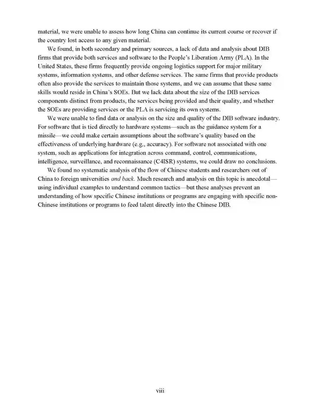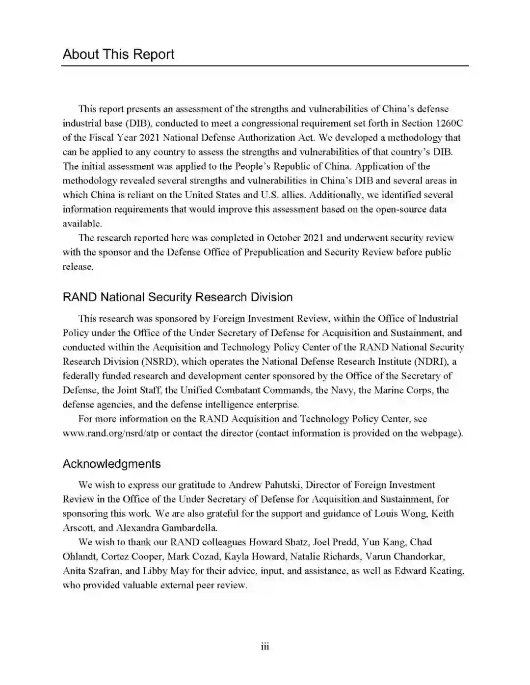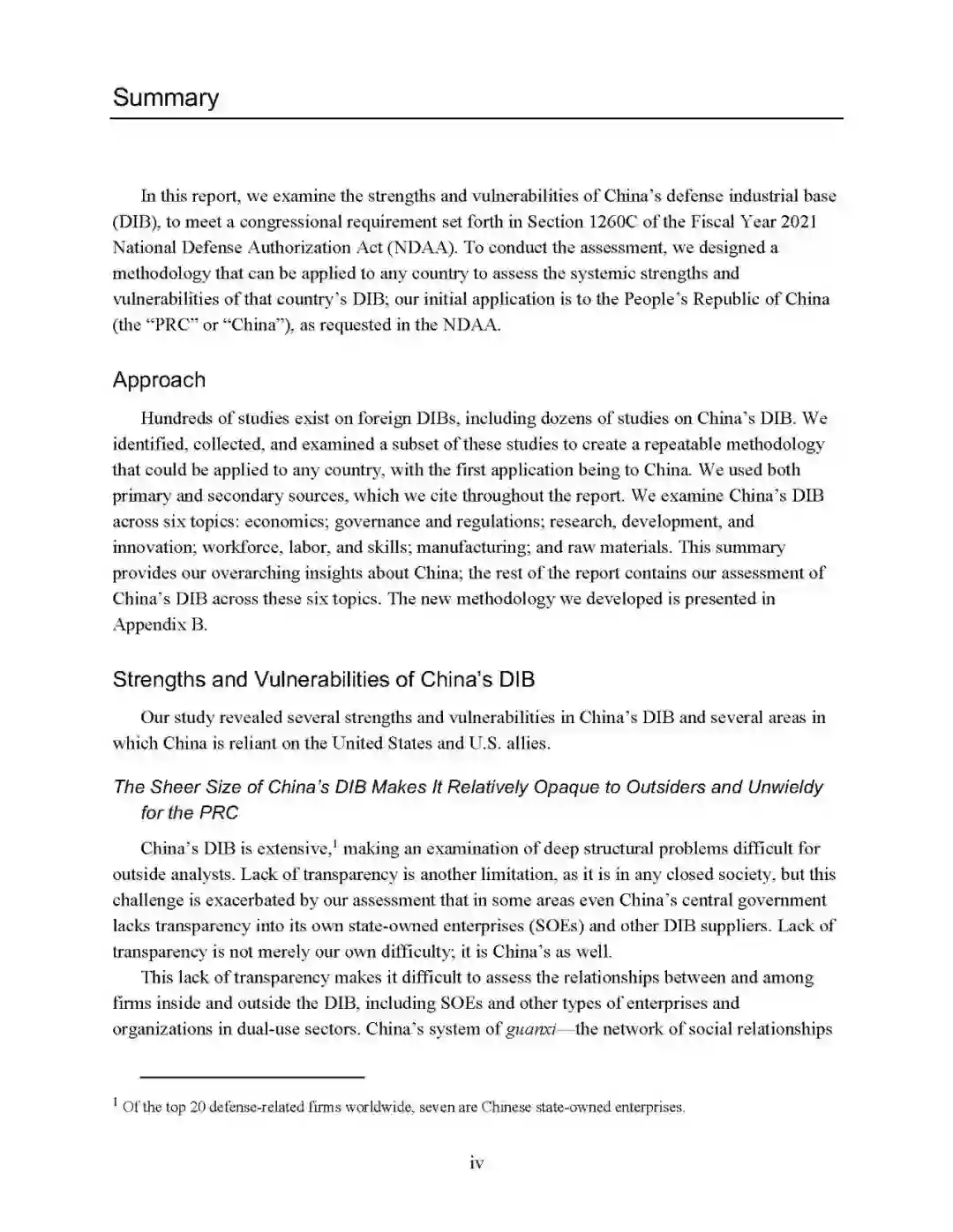 - 国防工业基础具有庞大规模但对内外均不透明报告认为:中国国防工业基础规模庞大,涵盖范围广,外部机构很难对深层次的结构性问题分析透彻,难以评估国防工业基础中国有企业与其他企业的关系,也无法充分分析民营企业在国防工业基础中的角色。甚至在某些领域,政府对国有企业和其他军工供应商也缺乏全面掌握了解。