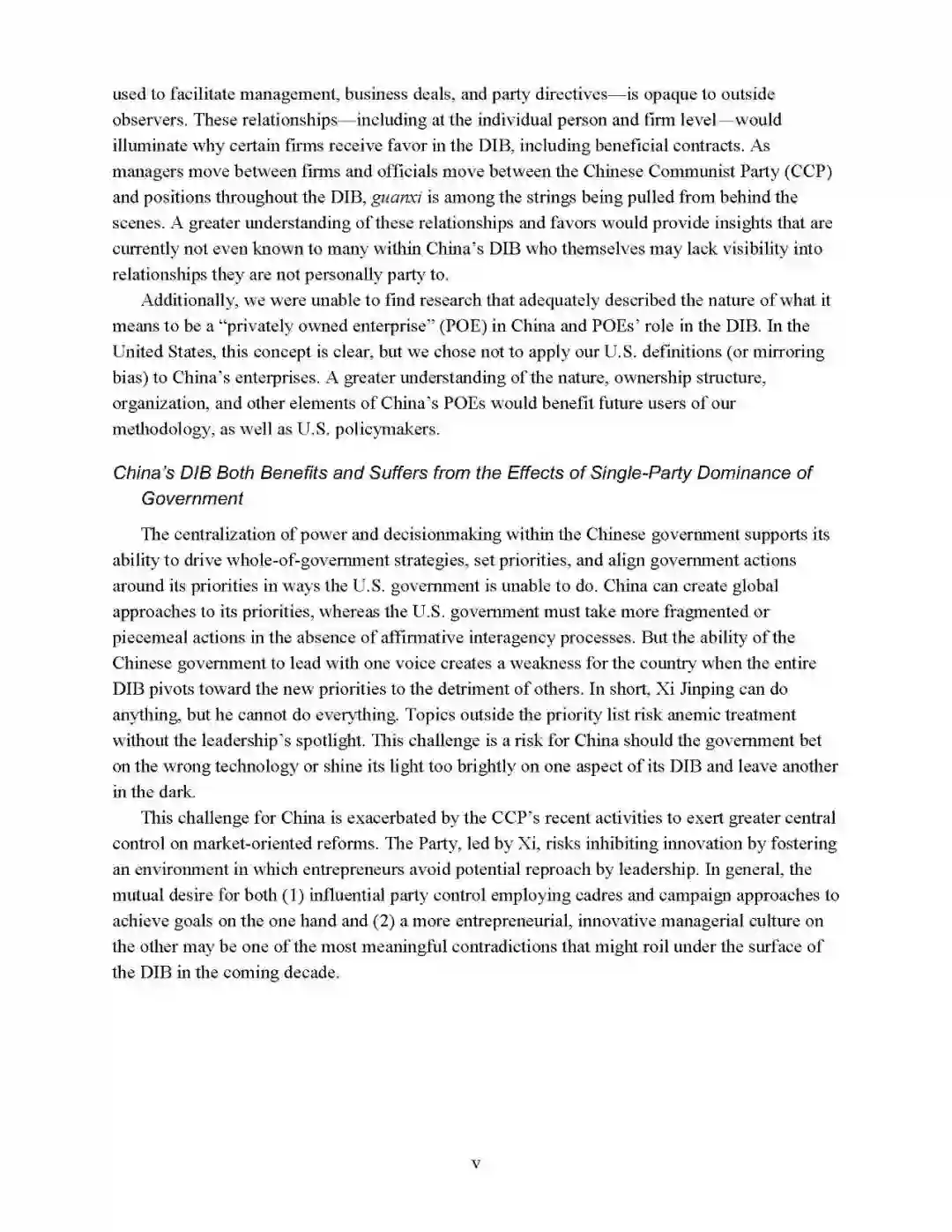 - 集中管理和决策模式既是发展优势也存在挑战报告认为:中国政府的集中管理和决策模式有助于推动整体战略、设定优先发展事项、统筹与协调。但优先发展事项的调整可能会损害利益相关方,管理模式会体现出一些弊端。优先发展之外的事项可能会忽略,或者重点关注的事项不一定是正确的技术方向。军工企业的创新培育与上层管理控制可能存在一定的矛盾,于中国的国防工业基础是一种风险。