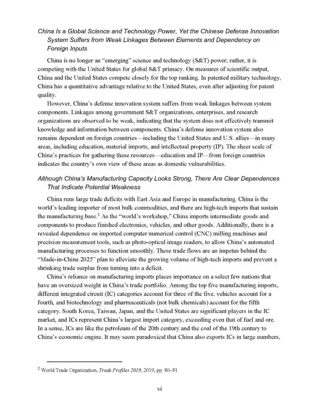 - 制造业发展强劲但高技术产品仍较多依赖进口报告认为:中国作为“世界工厂”,进口高技术产品支持了中国的制造业基础。中国的自动化制造依赖进口数控铣床、光学图像读取器等精密测量工具。在前五大制造业进口类别中,集成电路占3类,其他为汽车、生物技术和制药。中国也是集成电路出口大国,但主要为较大规格的普通集成电路。《中国制造2025》致力缓解不断增长的高技术产品进口数量。尽量如此,中国国防工业基础仍较多依赖进口,在2015-2020年,发动机仍占中国武器出口比重最大份额。