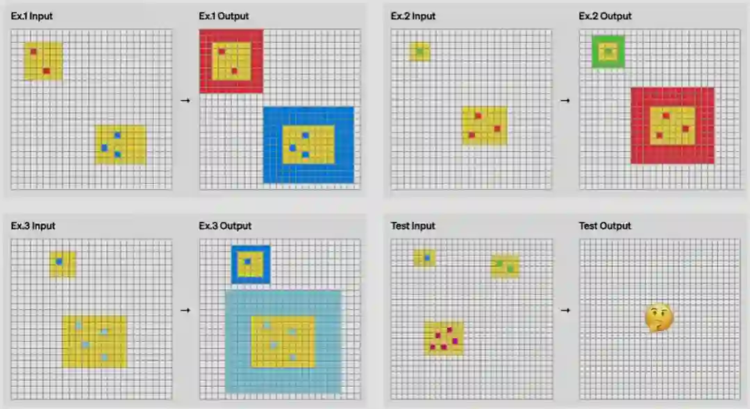 据介绍,o3 系列模型在 ARC-AGI 基准上的最低性能可达到 75.7%,而如果让其使用更多计算资源思考更长时间,o3 更是可以达到 87.5% 的水平。 在 ARC-AGI 基准中,AI 需要根据配对的「输入 - 输出」示例寻找规律,然后再基于一个输入预测输出,下图展示了一些例子。参加过毕业季招聘或公务员考试的人或许对此类图形推理问题并不陌生。