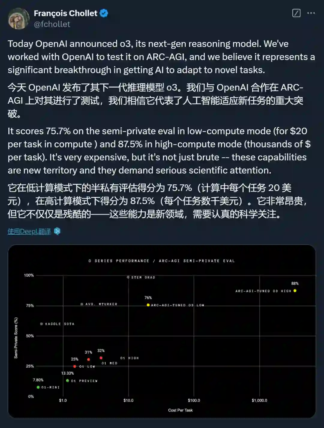 ARC-AGI 发起者、Keras 之父 François Chollet 在测试报告中写道,「(o3 系列模型)在高效率模式下取得的 75.7% 的分数符合 ARC-AGI-Pub 的预算规则(成本 <10000 美元),因此有资格在公共排行榜上排名第一!而它们在低效率模式下取得的 87.5% 的分数。虽然成本高昂,但仍然表明新任务的性能确实随着计算量的增加而提高(至少达到了这个水平)。」