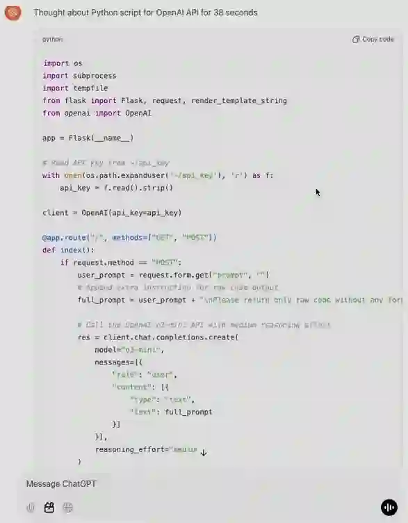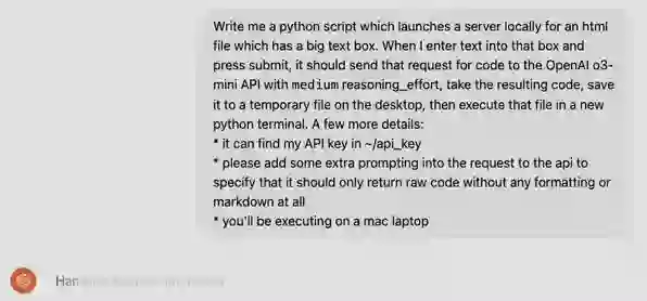 Hongyu Ren 现场演示了几个示例。首先,针对 o3-mini (high),任务是使用 Python 语言编写一个本地服务器,其有一个简易的用户 UI,同时可以将用户给出的文本消息通过 API 传输给 o3-mini 的 medium 选项,然后获取得到的代码,将其保存到桌面的一个临时文件中,然后在一个新的 Python 终端中执行该文件。