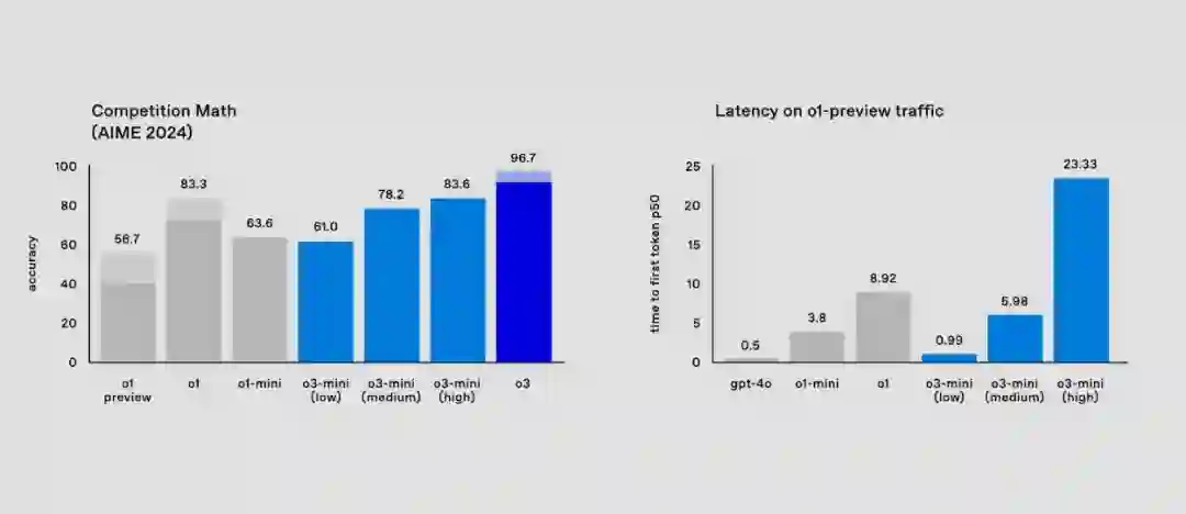 在数学问题上,o3-mini (low) 实现了与 gpt-4o 相当的低延迟。