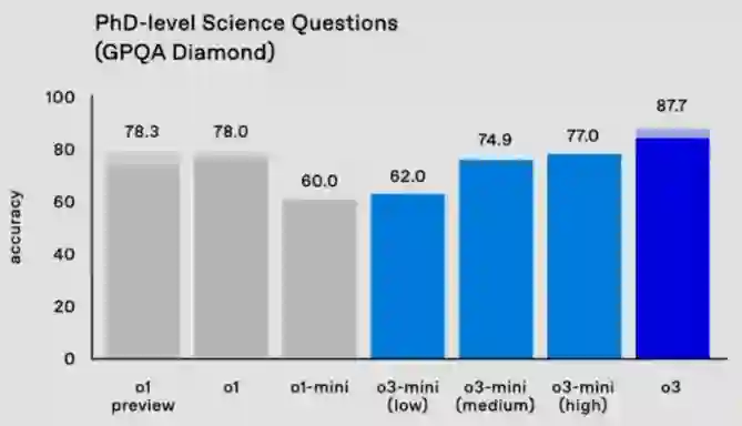Mark Chen 打趣地表示明年要让 AI 演示一下自我提升,但这个说法似乎不够 PR,让 Sam Altman 赶忙说了一句:「Maybe not.」 另外,他们也给出了在 GPQA Diamond 数据集上的更多测试结果。可以看到,o3-mini (low) 的结果与上面演示示例得到的结果基本一致,而 o3 满血版更是可以得到 87.7 的高准确度分数。
