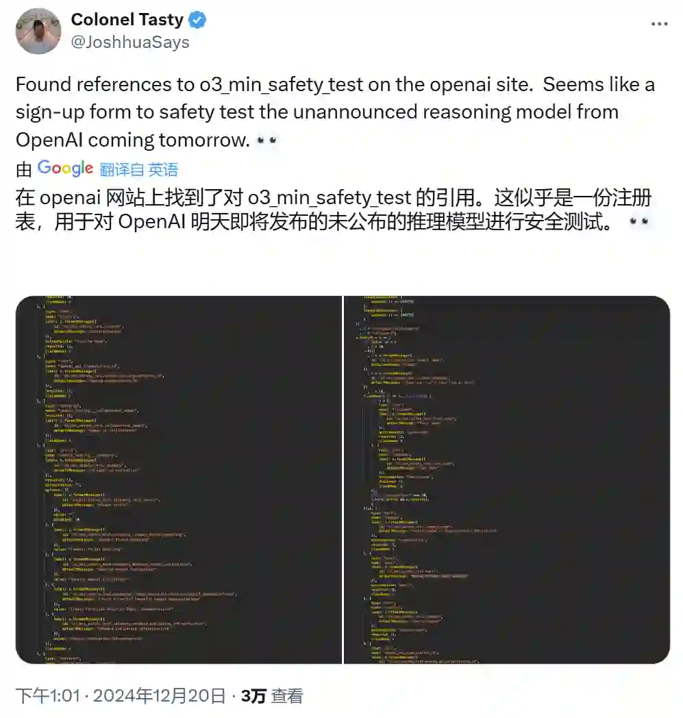 事实上,从昨天开始,OpenAI 就已经开始预热这个模型。而且已经有开发者在网上找到了 OpenAI 网站上对 o3_min_safety_test 的引用。
