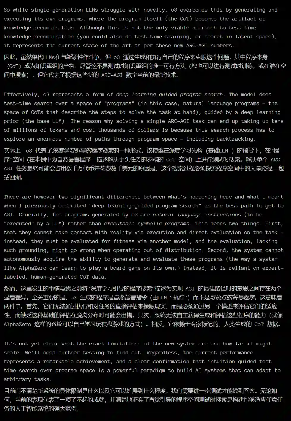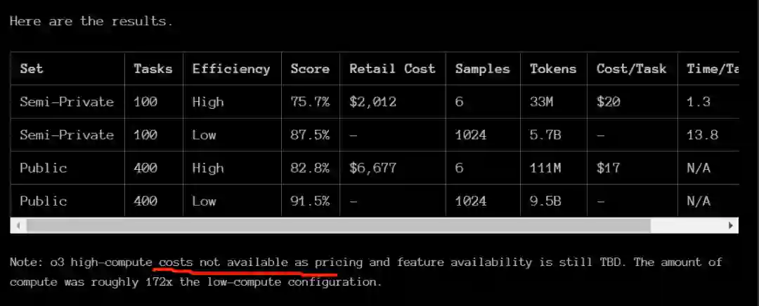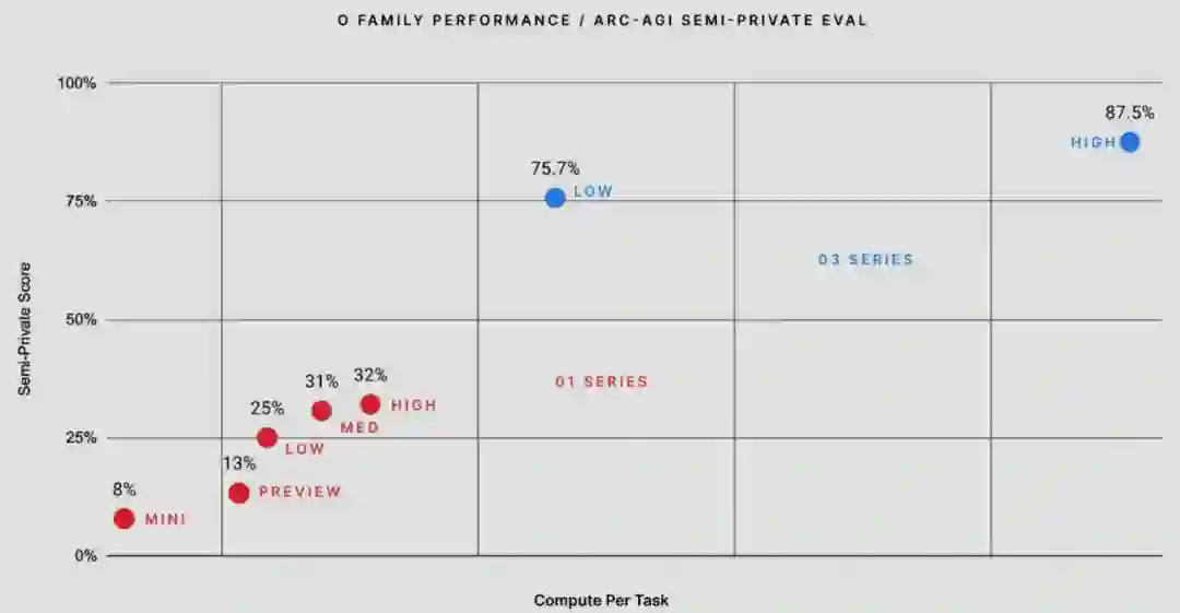 报告中还写道,尽管每项任务的成本很高(o3 在低计算量模式下每个任务需要 17-20 美元,高计算量模式下每个任务数千美元),但这些数字不仅仅是将暴力计算应用于基准测试的结果。OpenAI 的新 o3 模型代表了人工智能适应新任务的能力的重大飞跃。这不仅仅是渐进式的改进,而是真正的突破,标志着与 LLM 之前的局限性相比,人工智能能力发生了质的转变。o3 能够适应以前从未遇到过的任务,可以说在 ARC-AGI 领域接近人类水平的表现。