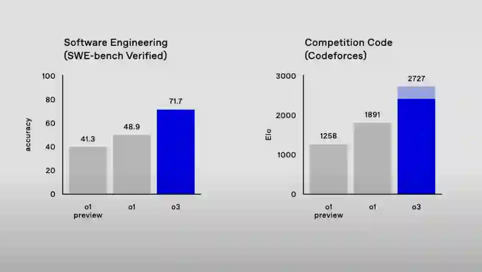 详细分析参见:https://arcprize.org/blog/oai-o3-pub-breakthrough 除了解决 ARC-AGI 这样的「IQ」 问题,o3 的编码能力也比之前的 o1 系列明显更胜一筹。在 SWE-bench Verified 基准上,o3 的准确率约为 71.7%,比 o1 模型高出 20% 以上。在 Competition Code 中,o3 获得了难以置信 2727 Elo 得分,而 o1 仅为 1891。