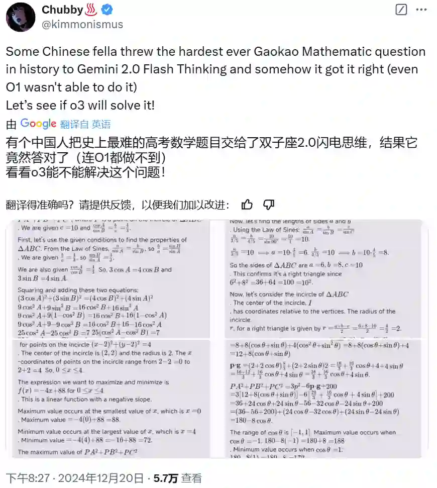 也有人早早就想看看 o3 究竟有何真本事,能否匹敌谷歌昨天发布的 Gemini 2.0 Flash Thinking。