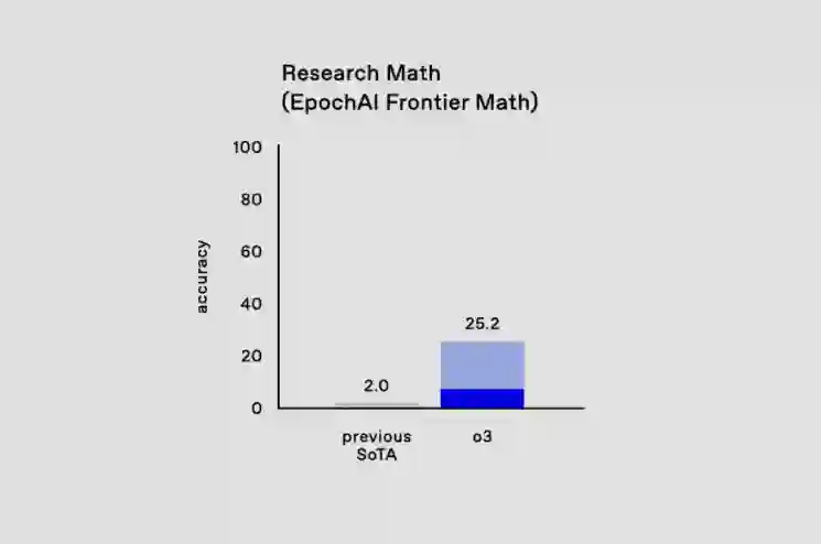 o3 在 OpenAI 研究人员认为最严格的基准之一(EpochAI Frontier Math)上的表现如下表所示。该数据集由新颖的、未发表的以及非常难、极其难的问题组成。 OpenAI 高级研究副总裁 Mark Chen 特别强调了,即使是专业数学家也需要几个小时甚至几天才能解决里面的问题之一。而今天,所有产品在这个基准上的准确率都低于 2%,o3 的准确率可以超过 25%。