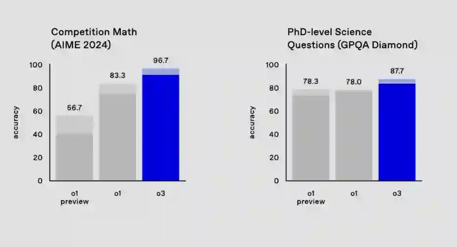 此外,o3 在竞赛数学(Competition Math )上的准确率达到 96.7%,在 GPQA Diamond (该基准衡量模型在博士级科学问题上的表现)上的准确率达到 87.7%,比之前的 o1 表现(78%)高出近 10%。总结来看,o3 在这两项基准测试上都达到了最佳表现。