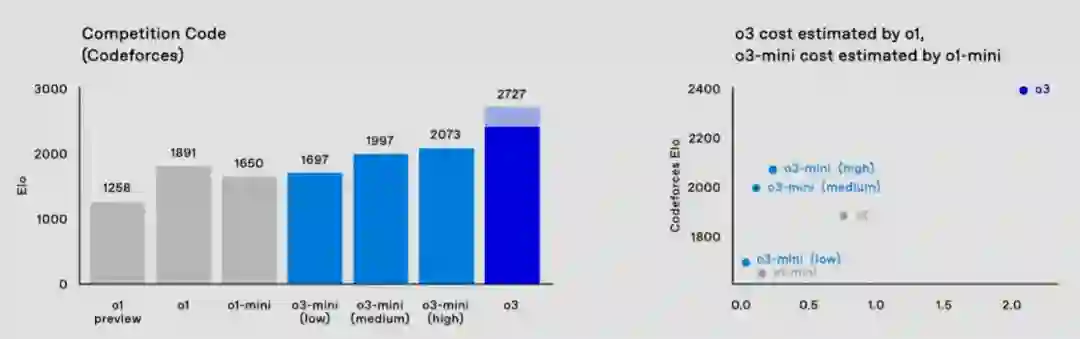 它支持三种不同的推理时间选项 —— 低、中、高。 与 o1 相比,o3-mini 在 Codeforces 上的性能具有显著的成本效益,这使其成为一个非常适合用来编程的模型。