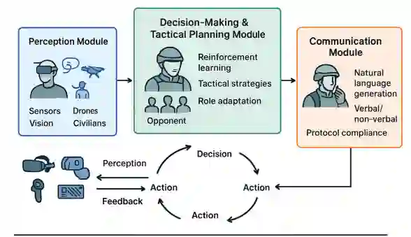 实弹野战演习与脚本化数字模拟一直是军事训练的组成部分。然而这些传统方法存在严重缺陷:运行成本高昂、真实性不足,且无法模拟战斗中的意外压力。脚本化非玩家角色(NPCs)具有可预测的行为模式,无法真实呈现新兴威胁、复杂环境以及角色(盟友、对手、平民)。战术准备不足的后果令人忧惧。例如在联合战备训练中心实施的大规模训练模拟中,3820名受训人员历经14天演练,累计642人阵亡(KIA)、1061人受伤(WIA),其中近半数伤者最终在战场死亡[1]。另一方面,尽管战场死亡率相较历史冲突(伊拉克、阿富汗)有所下降,但可预防性死亡数量仍居高不下;战术伤患护理(TCCC)训练虽有助于降低战场死亡率,却未能消除因失血、气道阻塞与张力性气胸损伤导致的死亡——这些伤情在获得适当院前救护时本可避免[2]。与此同时,战争本质正发生急剧演变。现代冲突不再以传统交战为特征,而是呈现无人驾驶航空器(无人机)执行监视与精确打击、网络战瘫痪通信后勤、心理/信息战操控认知士气的新型态势[3][4]。士兵必须学会在这种多维威胁环境中生存,军事力量正运用数字与心理武器隐蔽其作战行动。此种复杂性要求训练条件能使战斗员不仅应对物理敌人,还需应对旨在误导的信息战役、无人机攻击与非正规威胁。视觉、语音与触觉推理的多模态特性(其中人工智能称为生成式人工智能)使模拟这些动态情境成为可能,从而生成能动态调整行为、战术与通信策略的虚拟化身。