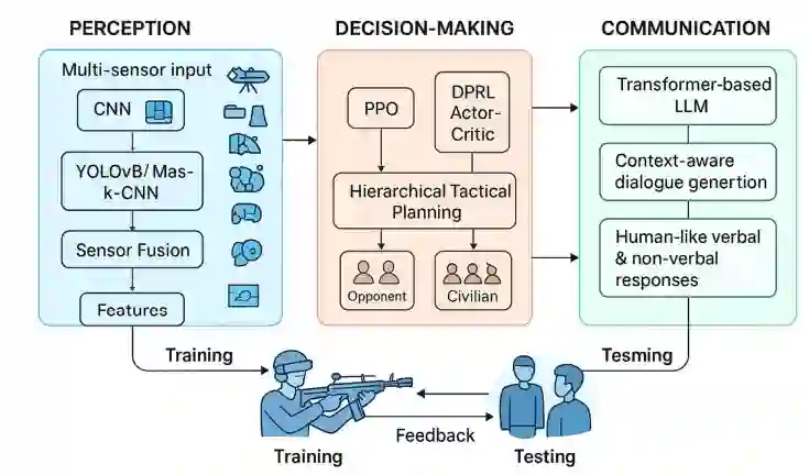 基于自适应行为框架,该系统集成感知、决策与通信环节的人工智能模型以实现动态虚拟士兵。感知模块运用卷积神经网络(CNNs)、传感器融合与目标检测(YOLOv8/Mask R-CNN)处理多模态输入;决策模块采用深度强化学习(PPO、Actor-Critic)与分层规划实现情境感知战术行动;通信模块借助基于Transformer架构的大型语言模型(LLMs)在军事语料库上微调,生成符合协议的现实言语交互。数据沿感知→决策→通信路径无缝流动,通过连续反馈循环在训练会话中持续优化模型性能(见图2)。