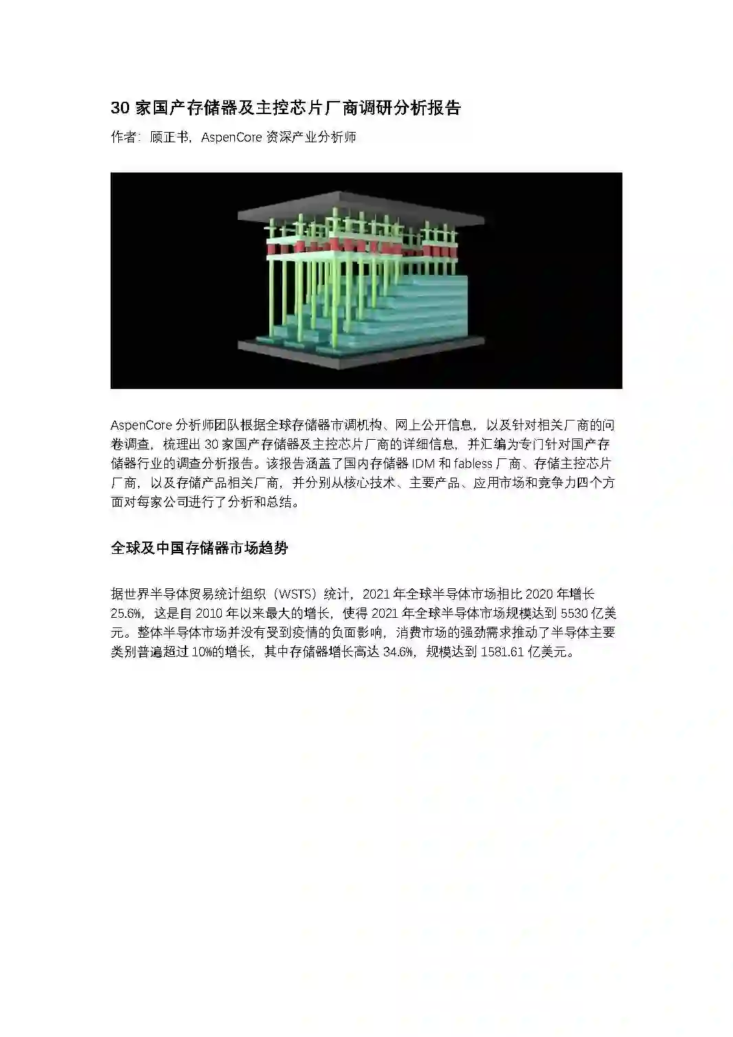 AspenCore 分析师团队根据全球存储器市调机构、网上公开信息,以及针对相关厂商的问 卷调查,梳理出 30 家国产存储器及主控芯片厂商的详细信息,并汇编为专门针对国产存 储器行业的调查分析报告**。该报告涵盖了国内存储器 IDM 和 fabless 厂商、存储主控芯片 厂商,以及存储产品相关厂商,并分别从核心技术、主要产品、应用市场和竞争力四个方 面对每家公司进行了分析和总结**。