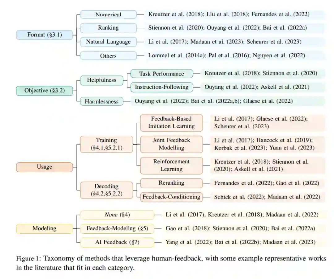 反馈作为一个概念,包含了广泛的含义和解释(Wiener,1948);然而,可以识别出一些普遍特征,如其格式、其预期结果以及它作为模型开发过程的一部分的使用方式。在本调查中,我们关注人类反馈在改进语言生成中的作用。我们首先对人类反馈的概念进行形式化,并创建一个文献中不同类型反馈的分类法,并说明它们是如何被使用的(§2)。我们讨论如何根据反馈的格式和目标描述反馈,从期望的模型行为角度(§3)。我们讨论直接针对人类反馈优化模型的方法,例如使用人类奖励函数进行强化学习(§4)。然后,我们转向绕过直接反馈优化成本的方法,首先训练反馈模型来近似人类反馈,然后使用这些代理模型改进生成(§5)。我们讨论现有的人类反馈数据集,这些数据集通常如何收集,以及收集过程可能对模型行为的影响(§6)。最后,我们讨论一项最近的减少收集人类反馈需求的工作,通过利用大型语言模型的AI反馈(§7).