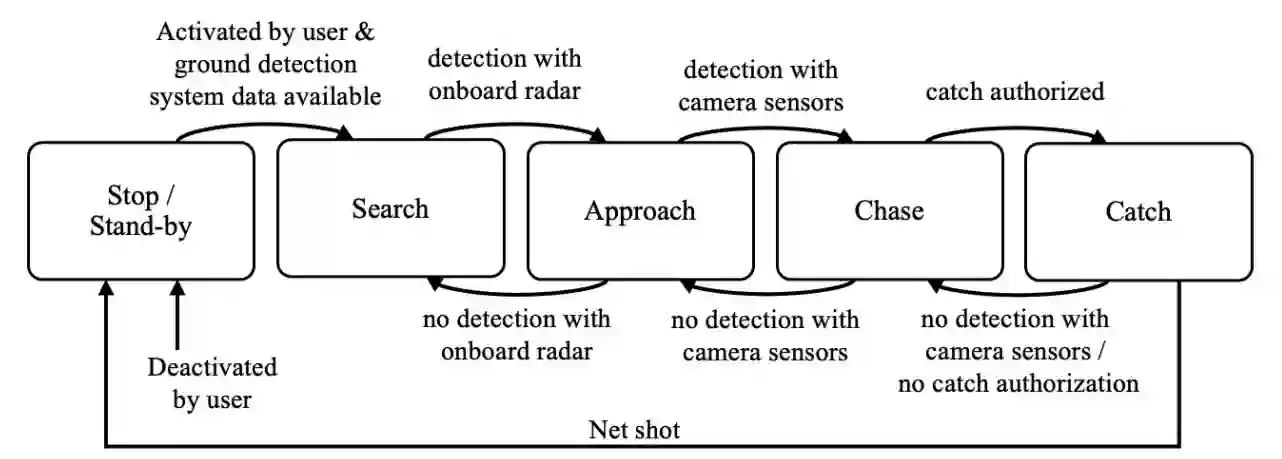 本文介绍的 cUAS 是一种全自动、多功能、可移动部署的系统,能够利用气压驱动的网状发射器拦截市场上几乎所有的小型无人机。与上述替代方案相比,所开发的 cUAS 不受未经授权的小型无人机操作模式的影响,即手动或自动控制,甚至不受全球导航卫星系统或射频的影响。我们的多传感器方法(照相机、激光雷达和雷达传感器)以及所实施的算法使 cUAS 能够在各种环境下运行,如开放式机场、军用场地和城市空间,在这些环境下,许多雷达反射通常会阻碍对小型物体的探测和跟踪。cUAS 可独立接近、跟踪和/或拦截速度高达 20 米/秒的已识别无人机,成功率超过 90%。