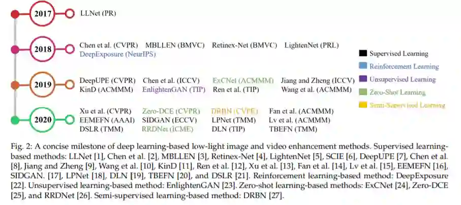 低光图像增强(Low-light image enhancement, LLIE)旨在提升低光环境下所采集图像的感知质量。该领域的近期进展主要由深度学习方法(包含不同学习策略、网络架构、损失函数、训练数据等)主导。本文进行了系统性综述以覆盖更多角度的理解,涵盖算法以及未解决问题。