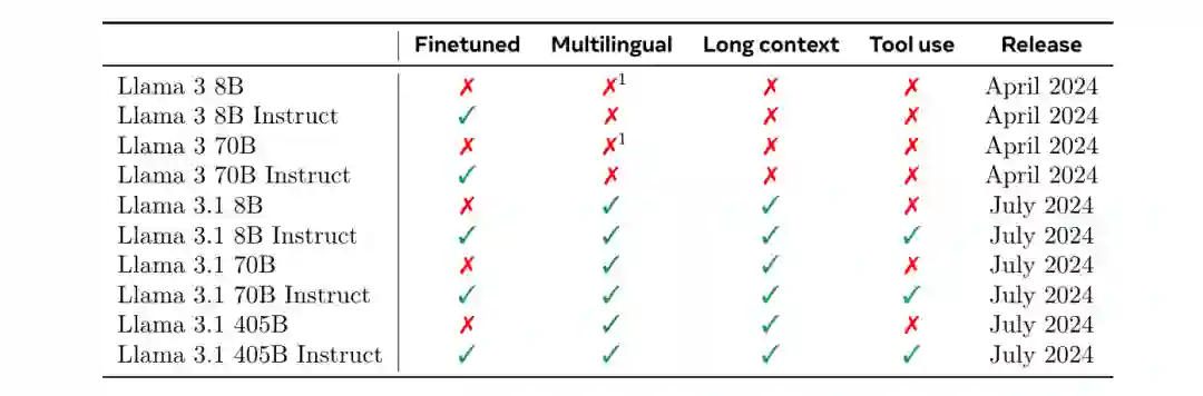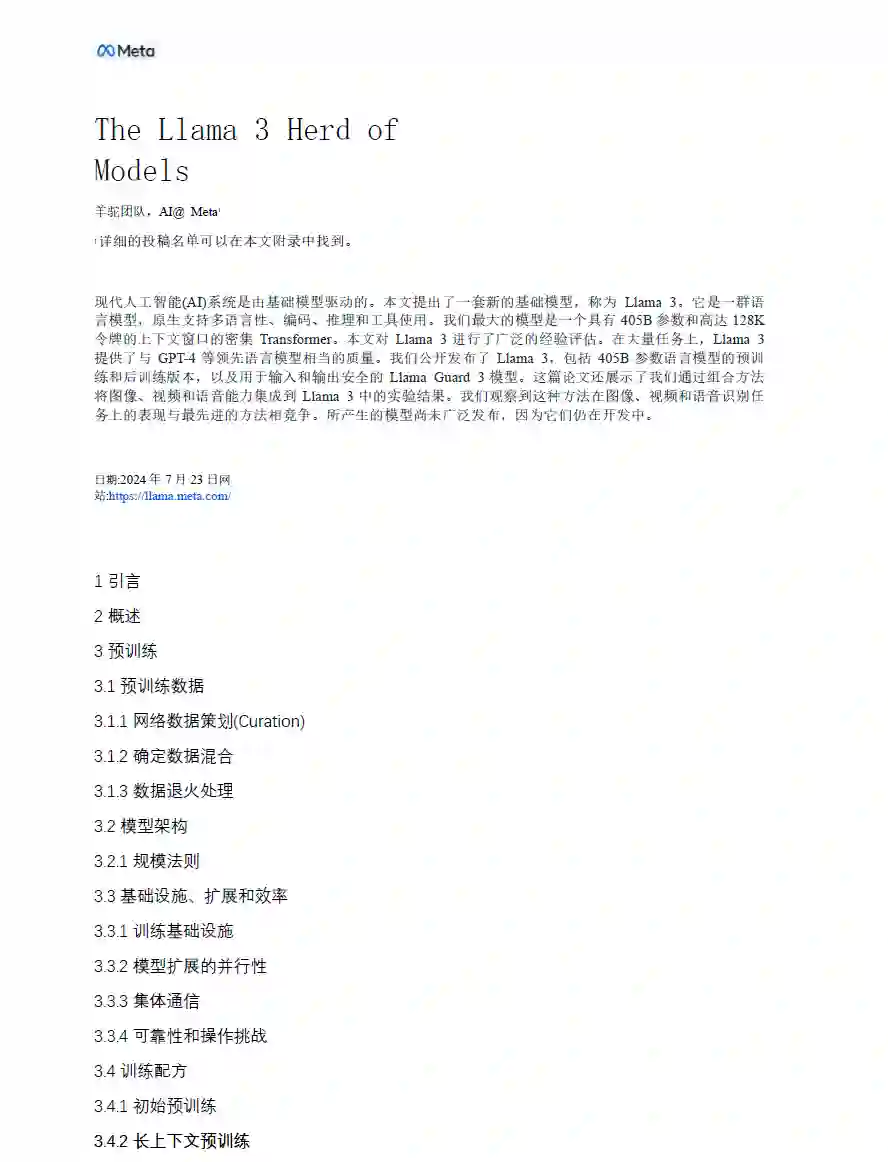在本文中,我们介绍了一套新的语言基础模型,称为Llama 3。Llama 3模型群原生的支持多语言、编码、推理和工具使用。我们最大的模型是一个具有4050亿参数的密集Transformer,能够在高达128K令牌的上下文中处理信息。表1列出了每个模型成员。本文中呈现的所有结果都是针对Llama 3.1模型的,为了简洁,我们将在全文中称之为Llama 3。
