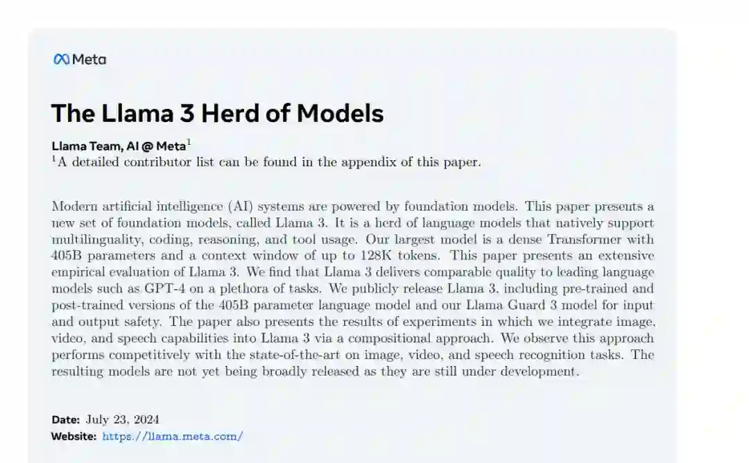 现代人工智能(AI)系统由基础模型驱动。本文介绍了一套新的基础模型,称为Llama 3。它是一群本地支持多语言、编码、推理和工具使用的语言模型。我们最大的模型是一个具有4050亿参数和高达128K令牌上下文窗口的密集Transformer。本文对Llama 3进行了广泛的实证评估。我们发现Llama 3在众多任务上提供了与GPT-4等领先语言模型相当的质量。我们公开发布了Llama 3,包括4050亿参数语言模型的预训练和后训练版本,以及我们的Llama Guard 3模型,用于输入和输出安全。本文还介绍了我们通过组合方法将图像、视频和语音能力集成到Llama 3中的实验结果。我们观察到这种方法在图像、视频和语音识别任务上与最先进的技术竞争。生成的模型尚未广泛发布,因为它们仍在开发中。